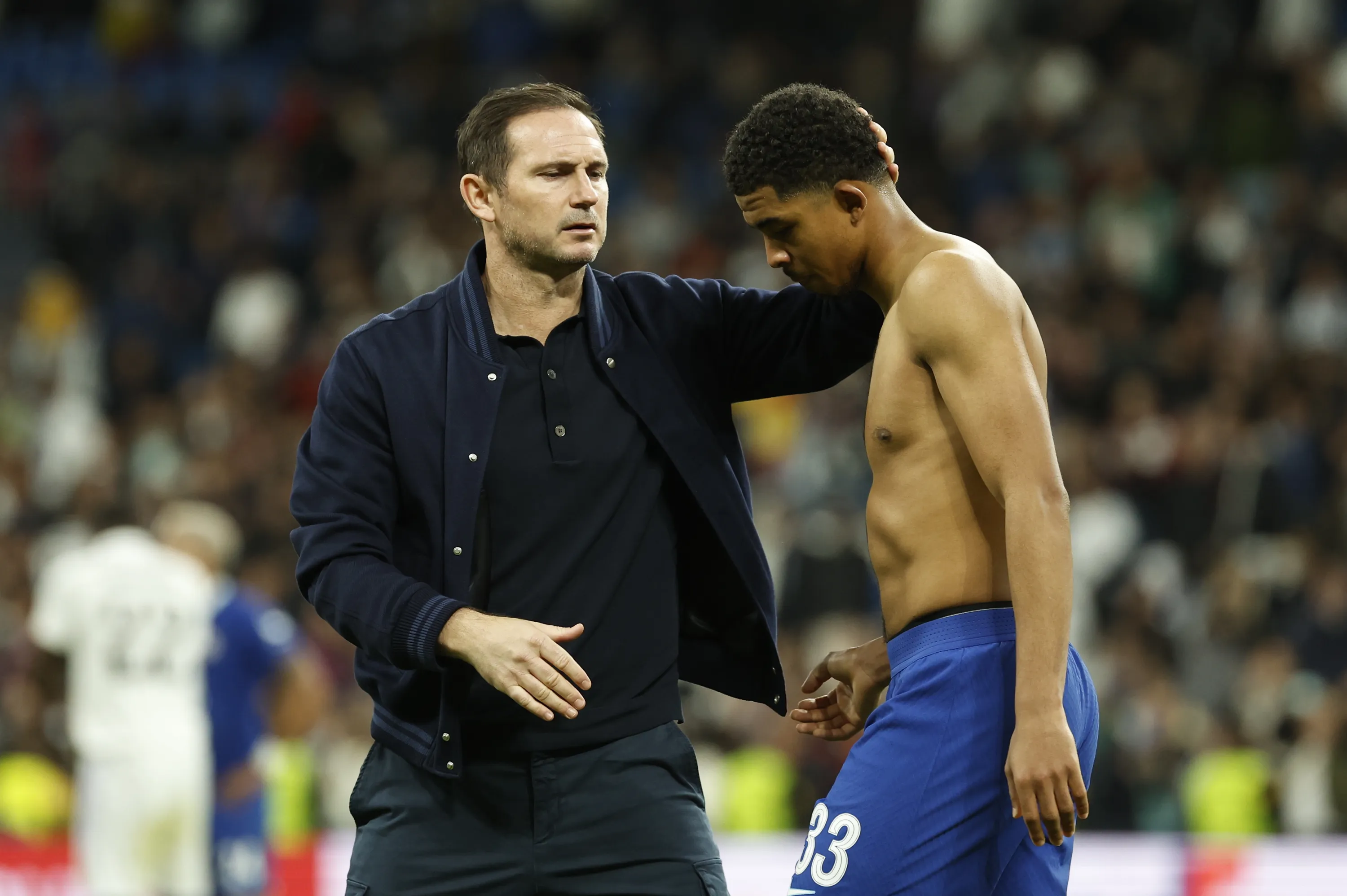Chelsea´s head coach Frank Lampard conforts Wesley Fofana (R) at the end of the UEFA Champions League quarter final first leg soccer match between Real Madrid and Chelsea FC, in Madrid, Spain, 12 April 2023. (Photo by Chema Moya/EPA)