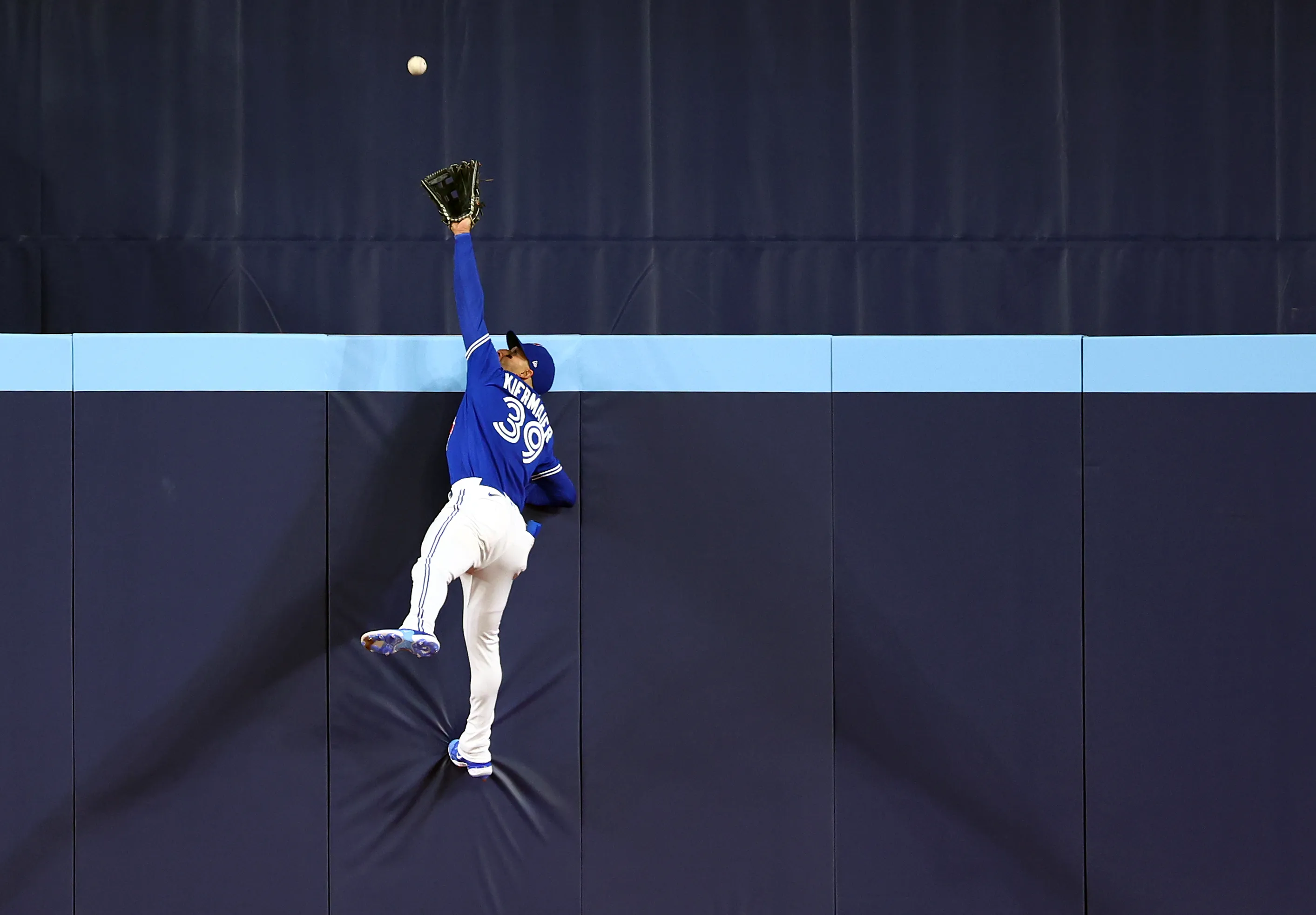 Kevin Kiermaier #39 of the Toronto Blue Jays catches a ball at the wall hit by Kerry Carpenter #30 of the Detroit Tigers for the first out of the second inning at Rogers Centre on April 11, 2023 in Toronto, Ontario, Canada. (Photo by Vaughn Ridley/Getty Images)