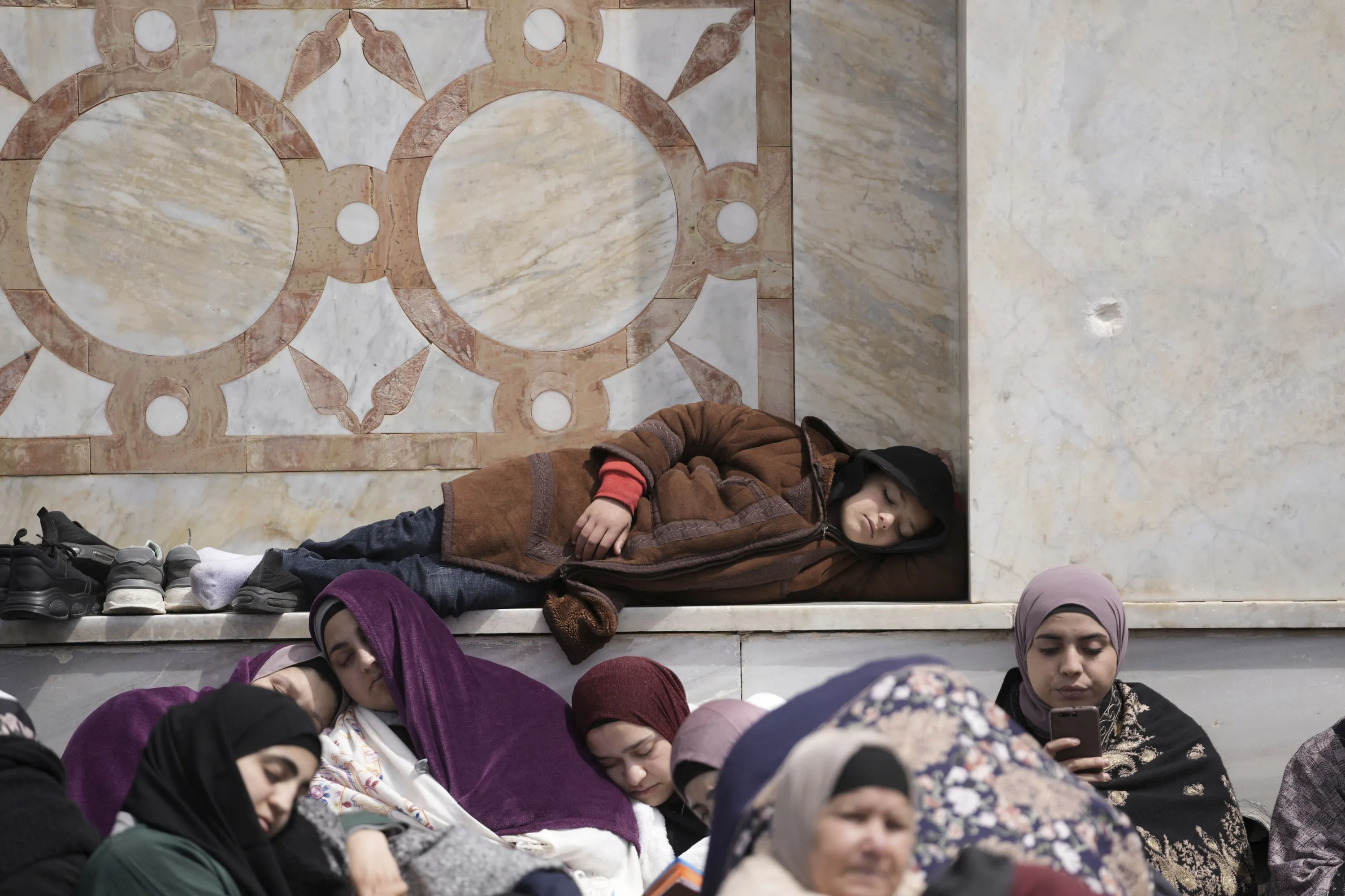 Palestinians rest before Friday prayers at the Dome of the Rock Mosque in the Al-Aqsa Mosque compound in the Old City of Jerusalem during the Muslim holy month of Ramadan, Friday, March 31, 2023. (Photo by Mahmoud Illean/AP Photo)