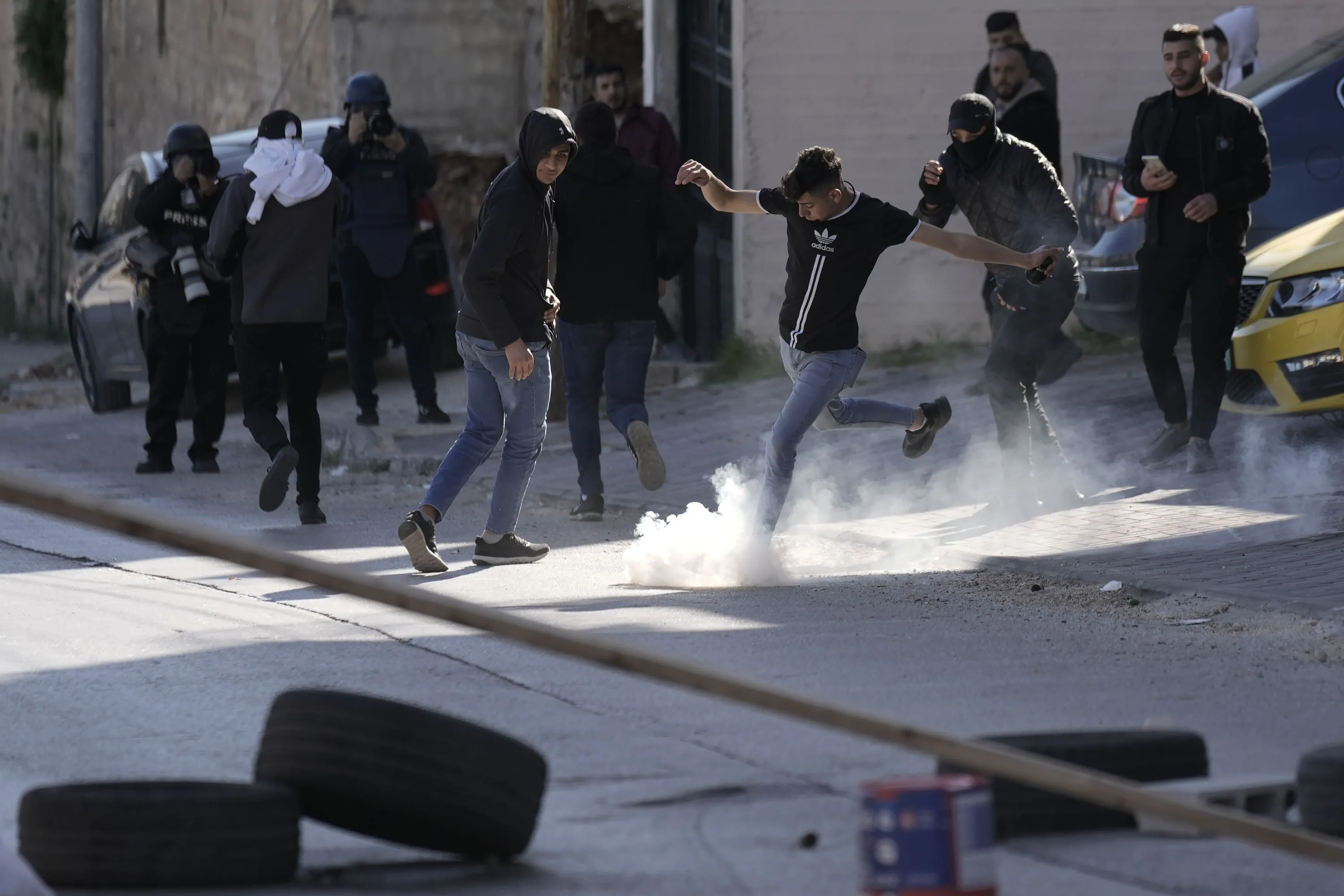 A Palestinian demonstrator kicks tear gas canister during clashes with Israeli forces during a raid in the West Bank city of Nablus, Monday, April 3, 2023. Two Palestinian men were killed by Israeli troops in an army raid in the occupied West Bank city of Nablus on Monday, the Palestinian Health Ministry said.The Israeli military said that troops arrested two people suspected of assisting a gunman who shot two soldiers in the occupied West Bank town of Hawara last month. The army said its soldiers came under fire during the raid and shot back. (Photo by Majdi Mohammed/AP Photo)
