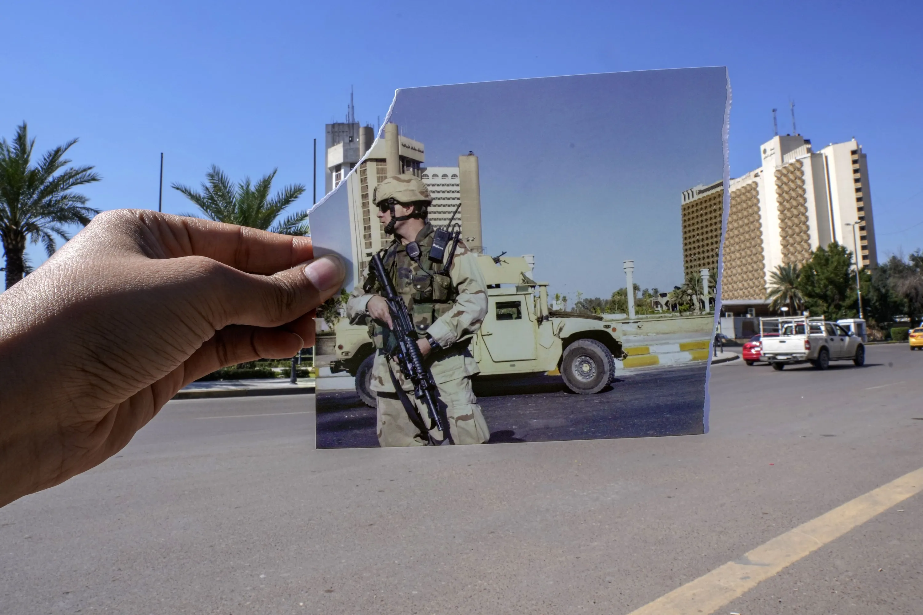 A photograph of a U.S. Army soldier standing guard in Firdous square in front of the Sheraton, left, and Palestine hotels after they came under rocket attack Friday, July 2, 2004 is inserted into the scene at the same location Friday, March 10, 2023, 20 years after the American led invasion on then country and subsequent war. (Photo by Hadi Mizban/AP Photo)