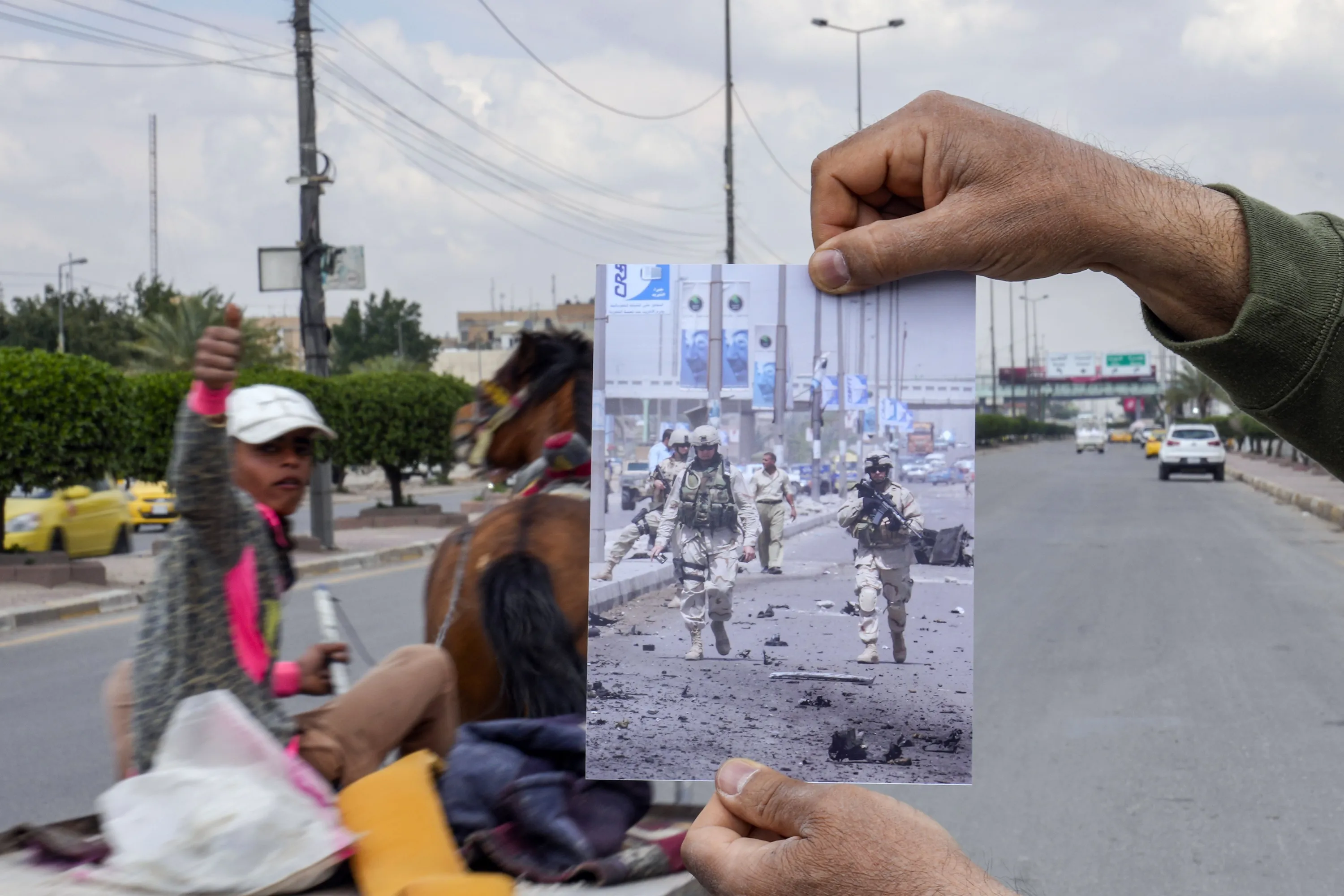 A photograph of U.S. soldiers securing the area where a car bomb exploded in the Maysalun square in Baghdad, Saturday, April 30, 2005, is inserted into the scene at the same location Tuesday, March 21, 2023, 20 years after the U.S. led invasion on Iraq and subsequent war. (Photo by Hadi Mizban/AP Photo)