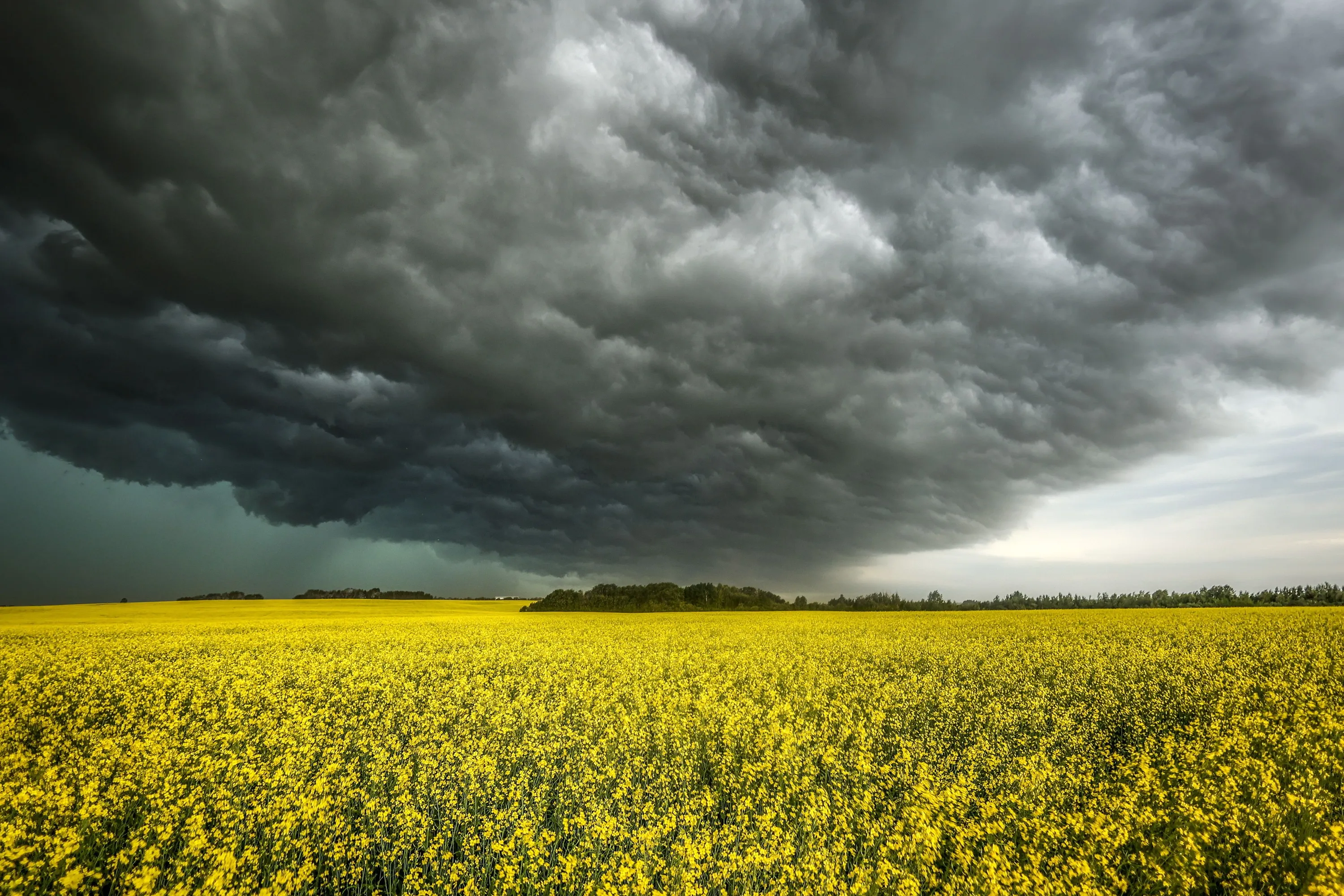 Storm clouds build over a canola field near Cremona, Alberta, Friday, July 29, 2022. (Photo by Jeff McIntosh/The Canadian Press via AP Photo)