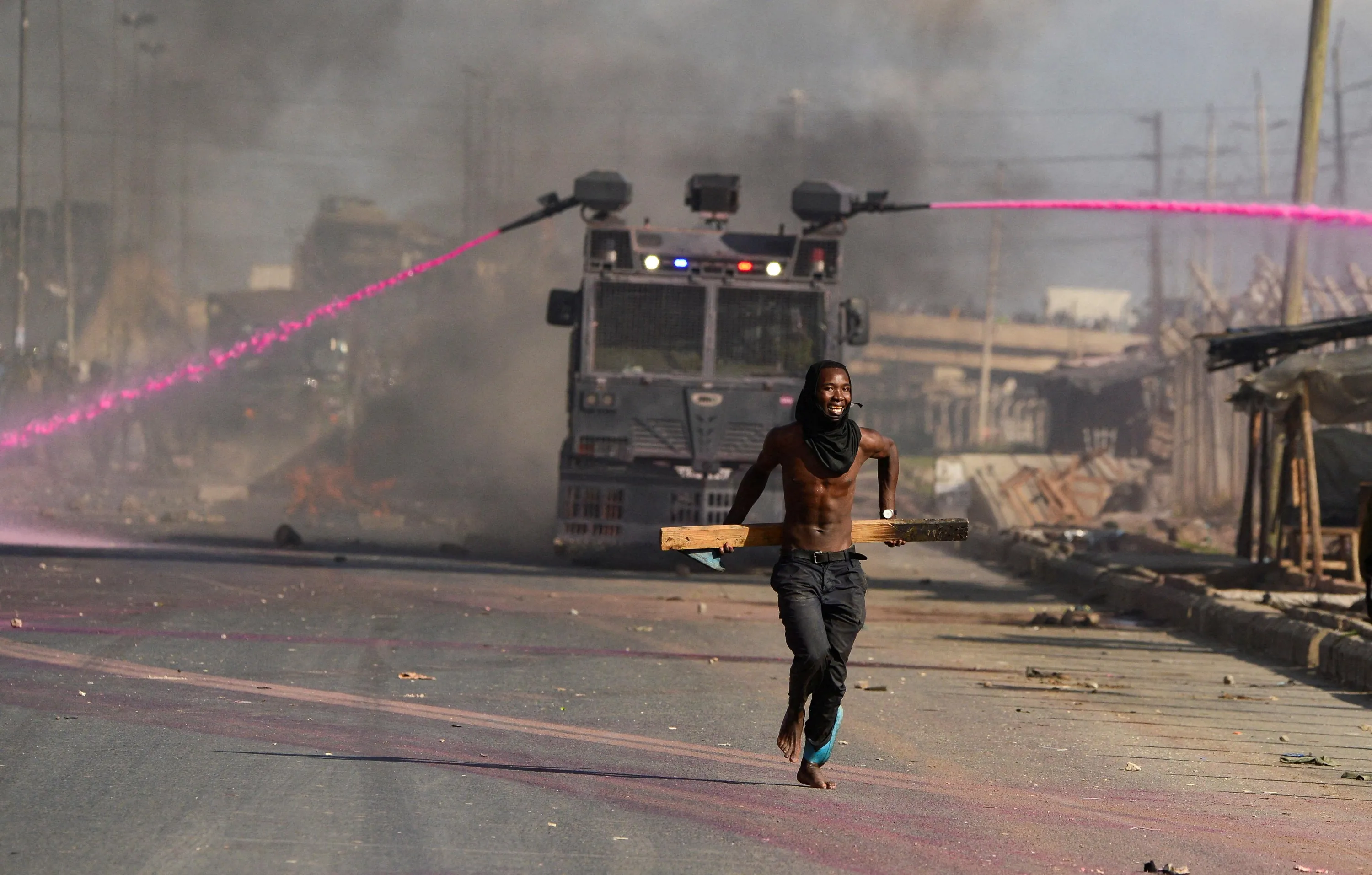 A supporter of Kenya's opposition leader Raila Odinga of the Azimio La Umoja (Declaration of Unity) One Kenya Alliance, runs in front of a water canon as they participate in a nationwide protest over cost of living and President William Ruto's government in Nairobi, Kenya on March 30, 2023. (Photo by John Muchucha/Reuters)