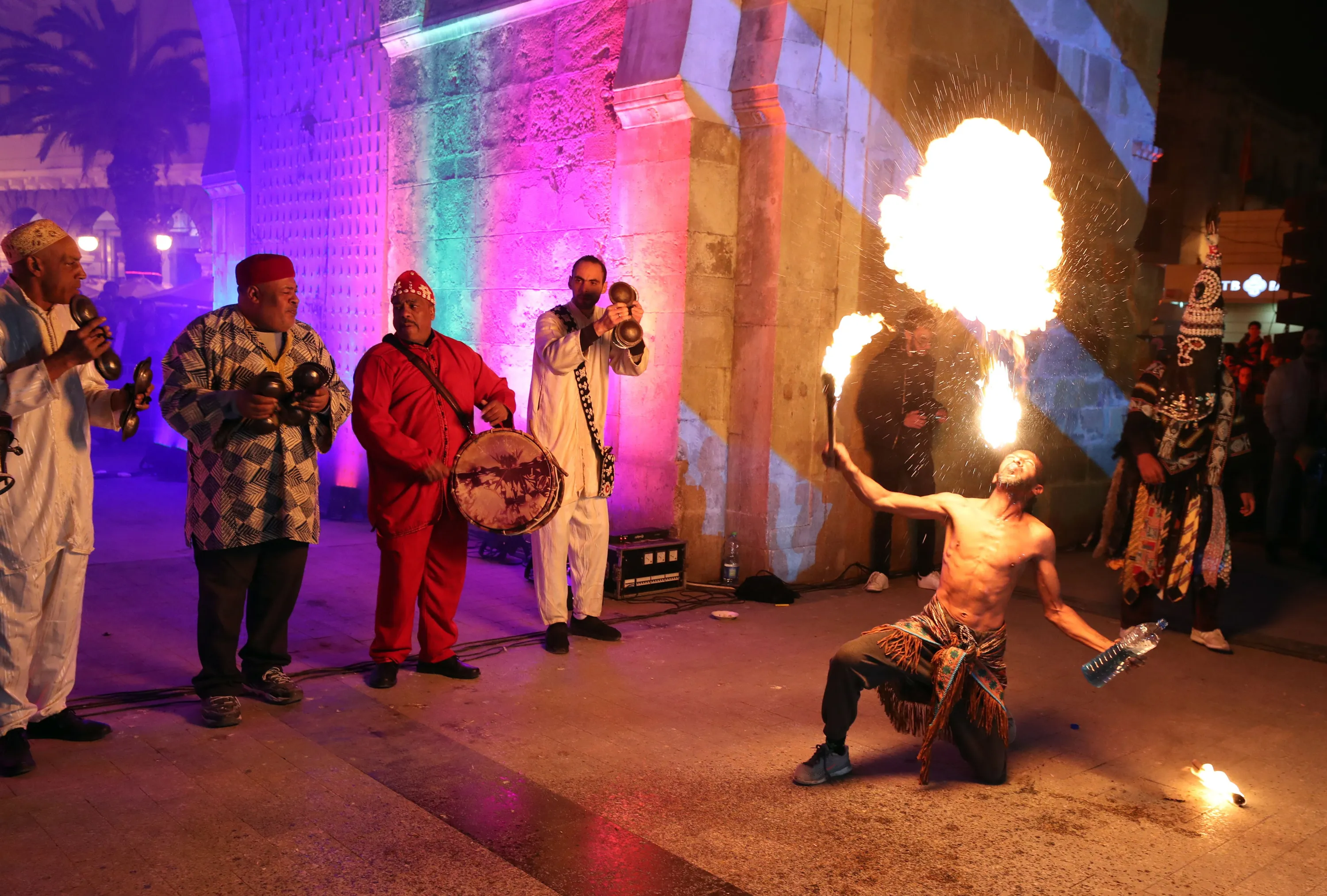 A member of the Soufi Stambali group spits fire during the second edition of the “Lighten Medina” festival in Tunis, Tunisia, 07 April 2023. The Lighten Medina festival was implemented by the Ministry of Tourism as part of the promotion of sustainable tourism projects in partnership with the Municipality of Tunis, the German Agency for International Cooperation, and the program “Tunis, our destination”. (Photo by Mohamed Messara/EPA)