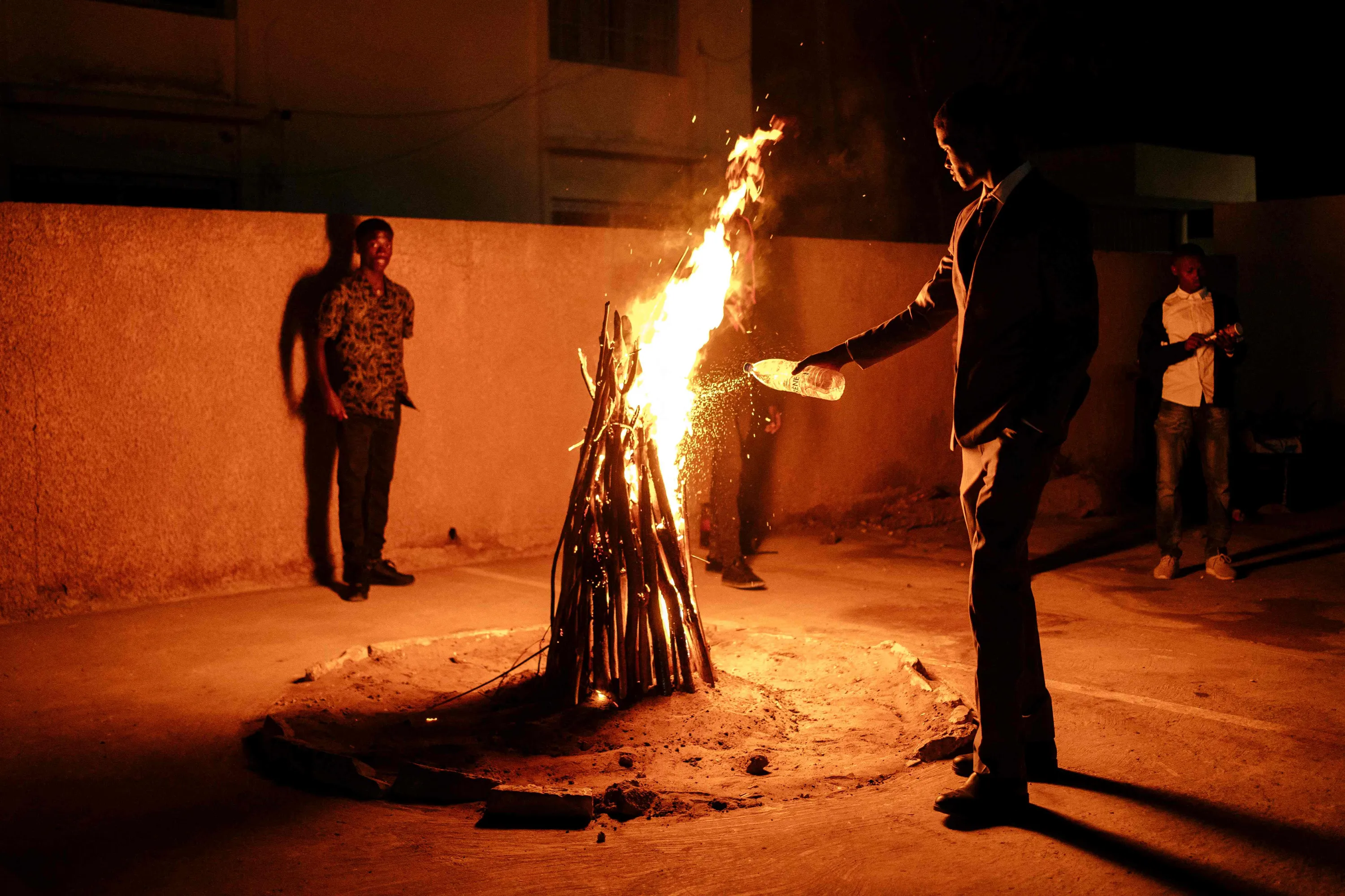 A fire is lit at the Our Lady of the Angels Church ahead of the Easter Vigil celebrations in Dakar, Senegal on April 8, 2023. (Photo by Carmen Abd Ali/AFP Photo)