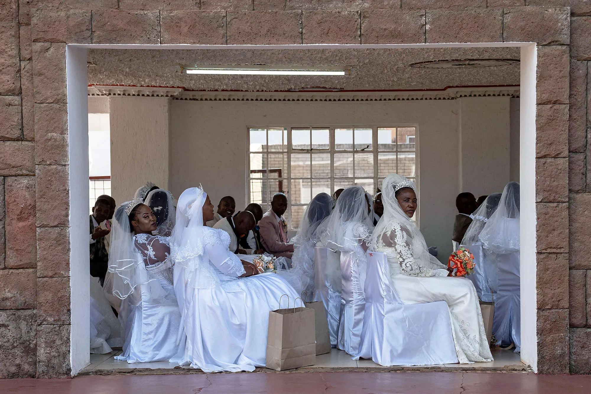A group of brides are seen waiting at the International Pentecostal Holiness Church in Zuurbekom, south of Johannesburg, as they take part in a mass wedding ceremony where 80 couples got married during the Easter Sunday service on April 9, 2023. (Photo by Ihsaan Haffejee/AFP Photo)