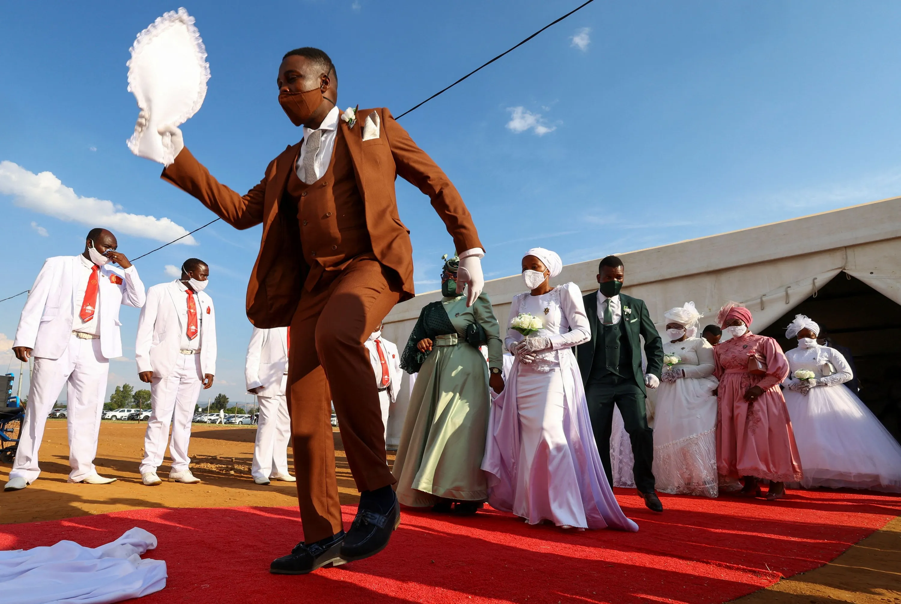 A groom dances as he is followed by some of the more than 800 couples taking part in the Easter Sunday mass wedding ceremony, organised by the International Pentecostal Holiness Church Jerusalem City (IPHC), in Kgabalatsane, in the North-West province, South Africa on April 9, 2023. (Photo by Siphiwe Sibeko/Reuters)