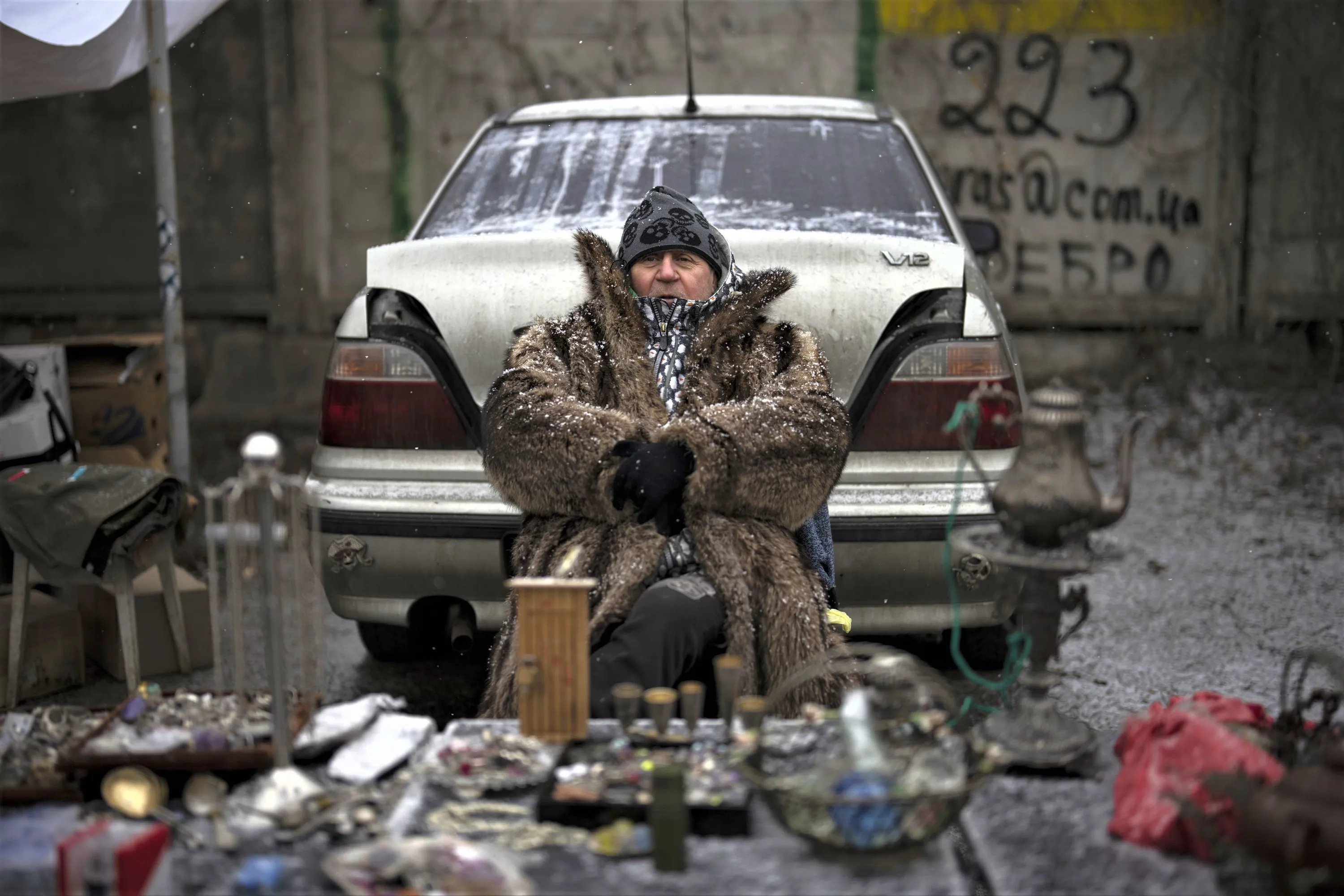 A vendor sits at a flea market in Kyiv, Ukraine, Saturday, February 4, 2023. (Photo by Daniel Cole/AP Photo)