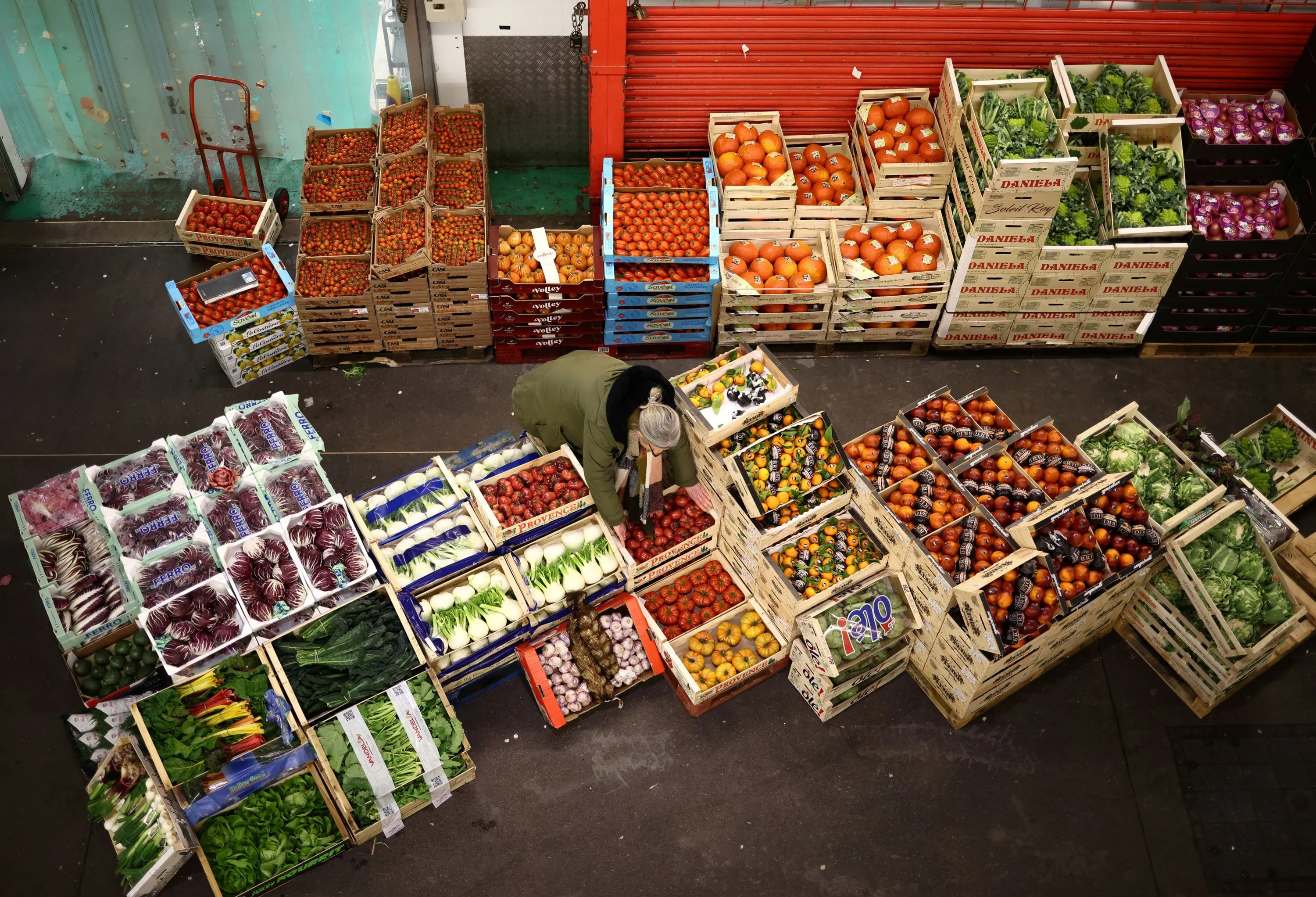 A person carries a box of tomatoes during early morning business hours at New Covent Garden Market in London, Britain on March 9, 2023. (Photo by Henry Nicholls/Reuters)