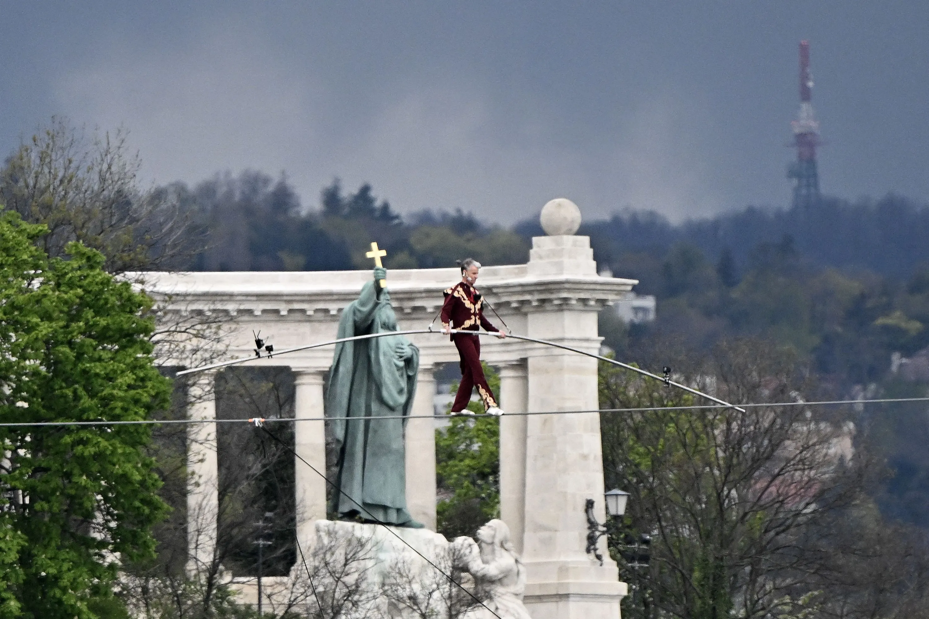 Hungarian high-wire artist Laszlo Simet Jr, 63, walks on a tightrope over the Danube in downtown Budapest on April 15, 2023. The tightrope, suspended in an altitude of 40 meters, is 300 meters long and has a diameter of 22 millimeters. Laszlo Simet Jr presents his unique performance as part of the opening event of the 10th International Theater Olympiad, as well as on World Circus Day. (Photo by Attila Kisbenedek/AFP Photo)