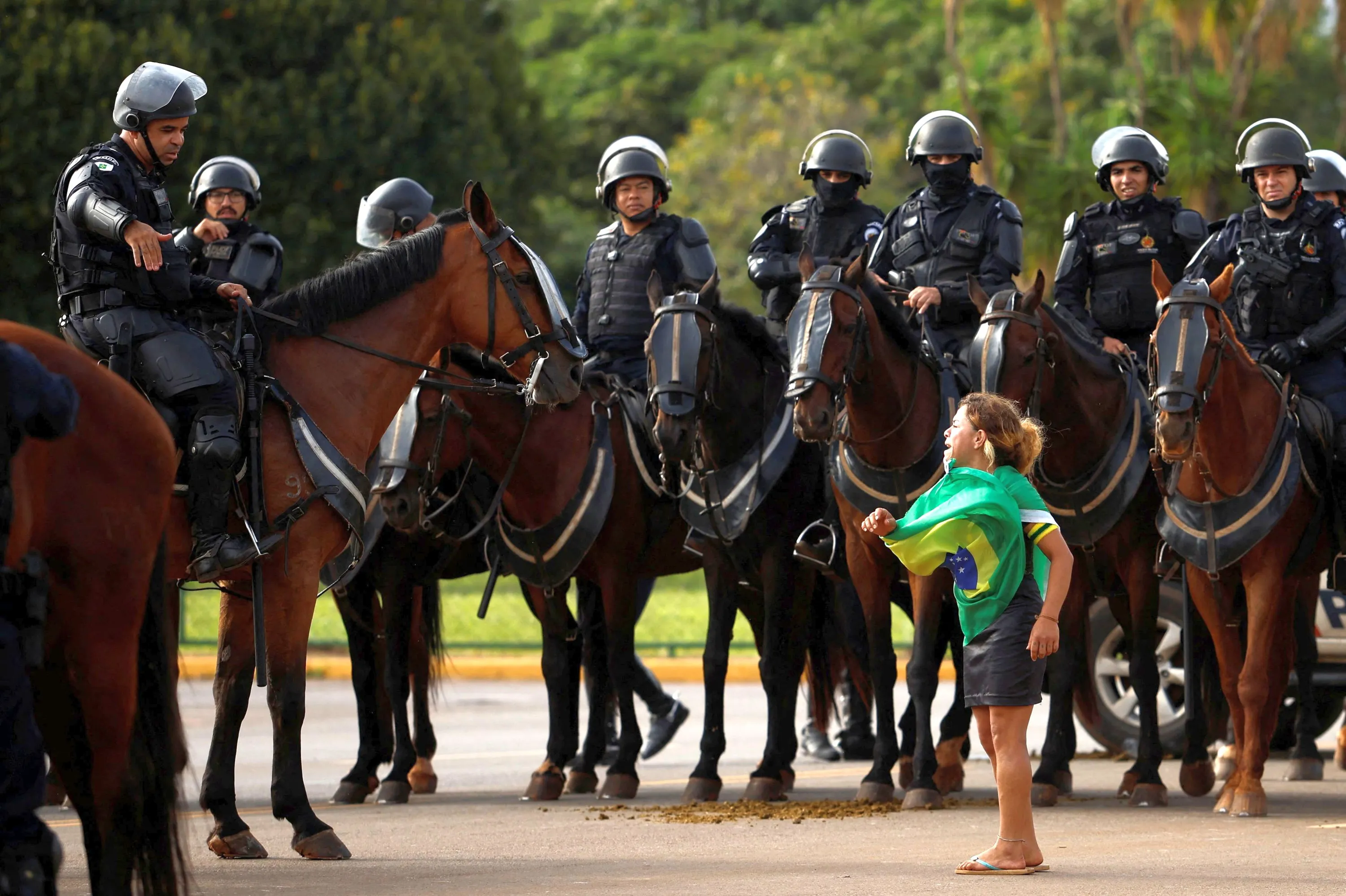 A demonstrator reacts next to members of security forces as supporters of Brazil's former President Jair Bolsonaro leave a camp outside the Army Headquarters, in Brasilia, Brazil on January 9, 2023. (Photo by Amanda Perobelli/Reuters)