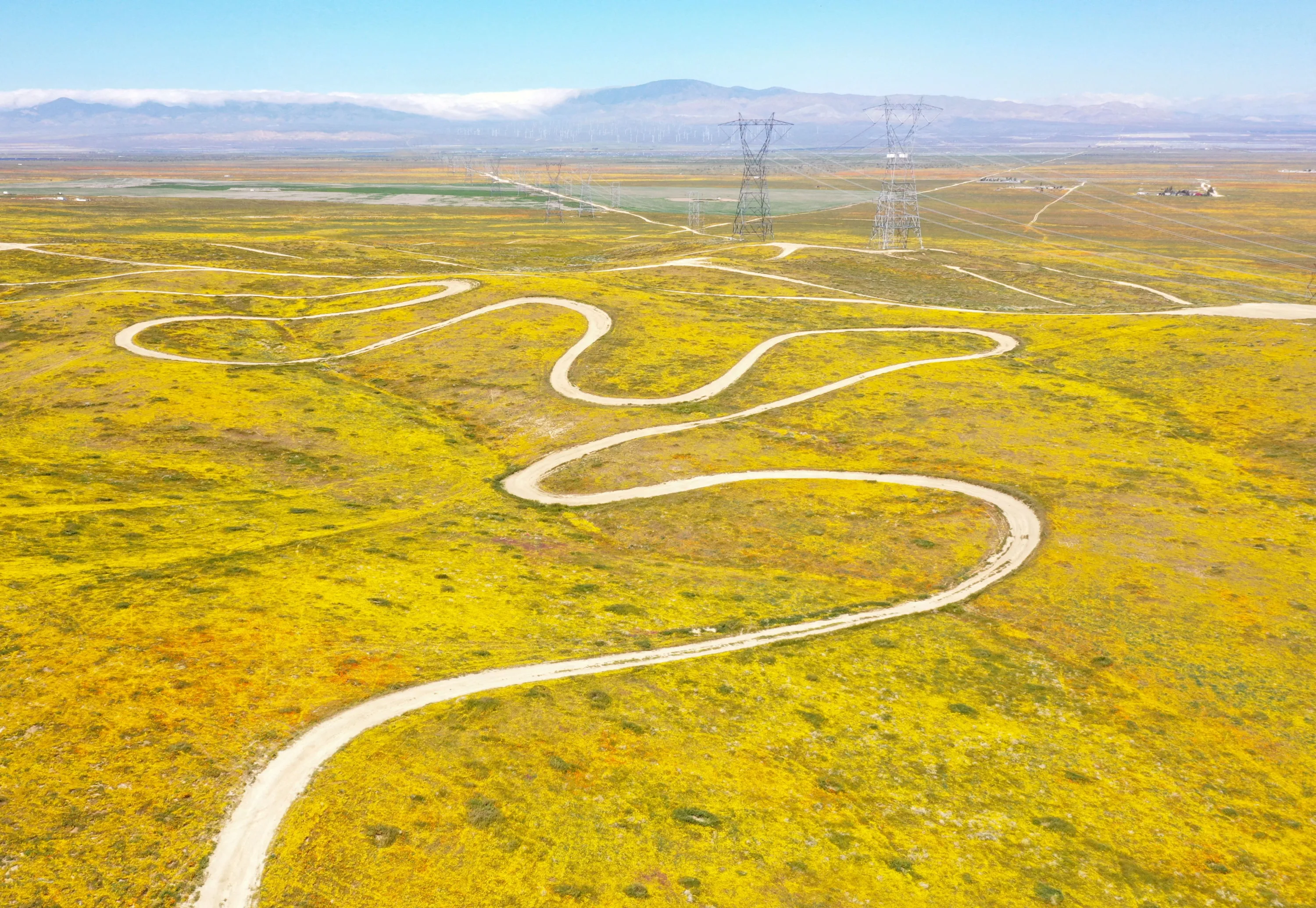An aerial view of a field of poppies and other wildflowers near the Antelope Valley California Poppy Reserve in Lancaster, California, U.S., April 13, 2023. (Photo by Aude Guerrucci/Reuters)