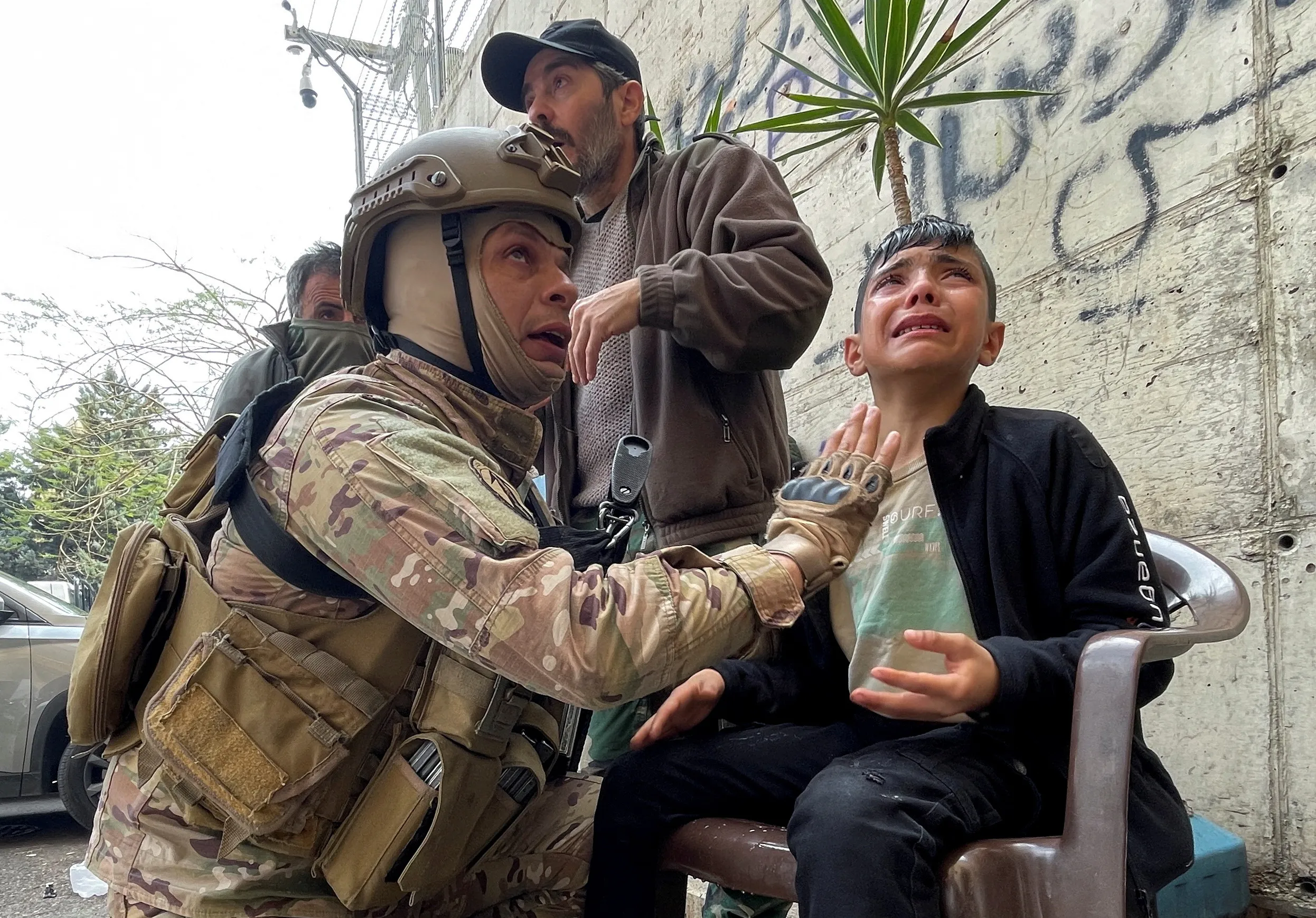 A Lebanese army soldier assists a boy, affected by tear gas, during a protest over the deteriorating economic situation in Beirut, Lebanon on March 22, 2023. (Photo by Issam Abdallah/Reuters)