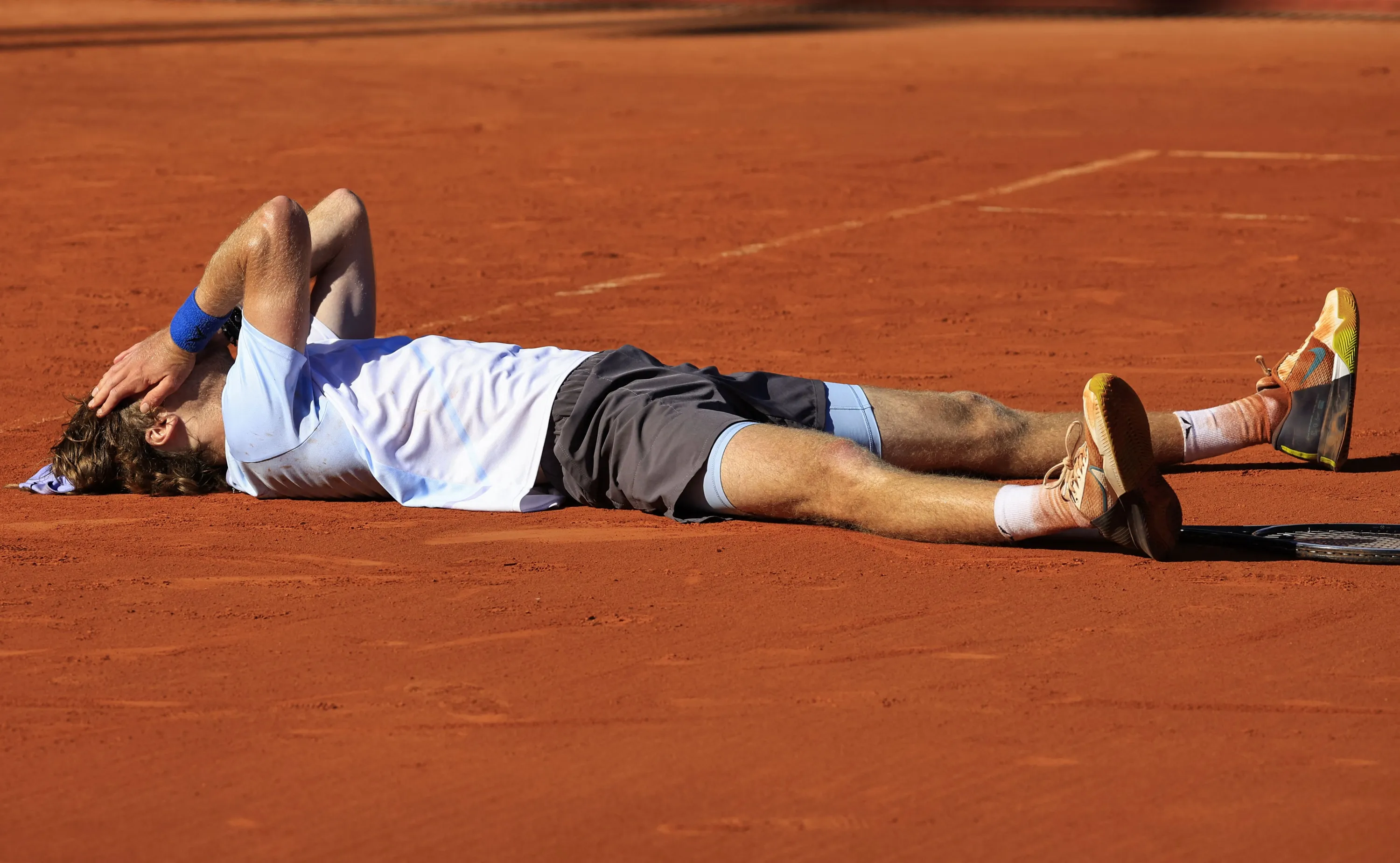 Russia's Andrey Rublev celebrates after winning the final Monte-Carlo ATP Masters Series tournament tennis match against Denmark's Holger Rune in Monte Carlo on April 16, 2023. (Photo by Valery Hache/AFP Photo)