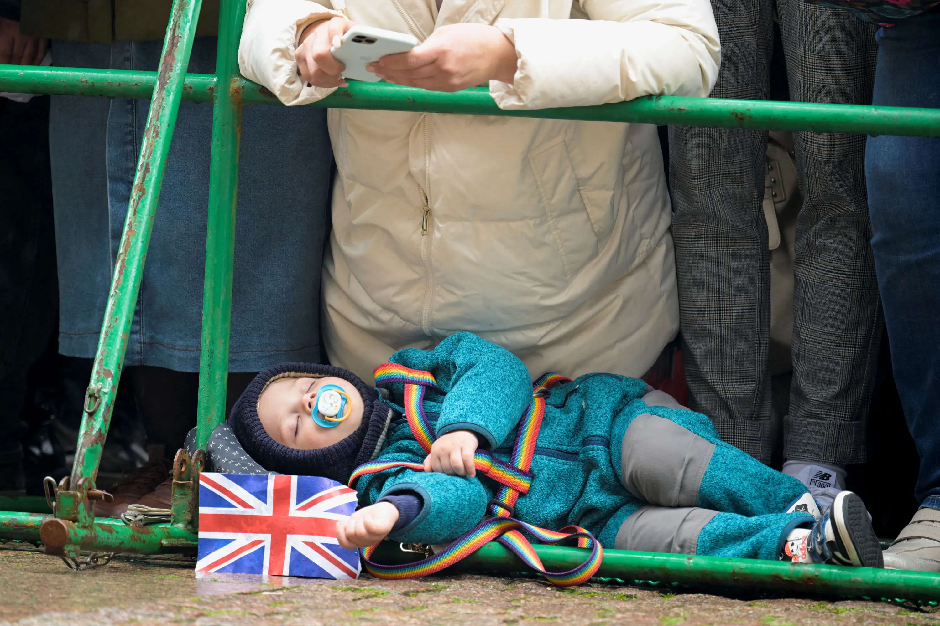 Johann-Maxilian, a 2 and a half year old child, lies on the ground as the members of the public wait for Britain's King Charles to visit the town hall, in Hamburg, Germany on March 31, 2023. (Photo by Fabian Bimmer/Reuters)
