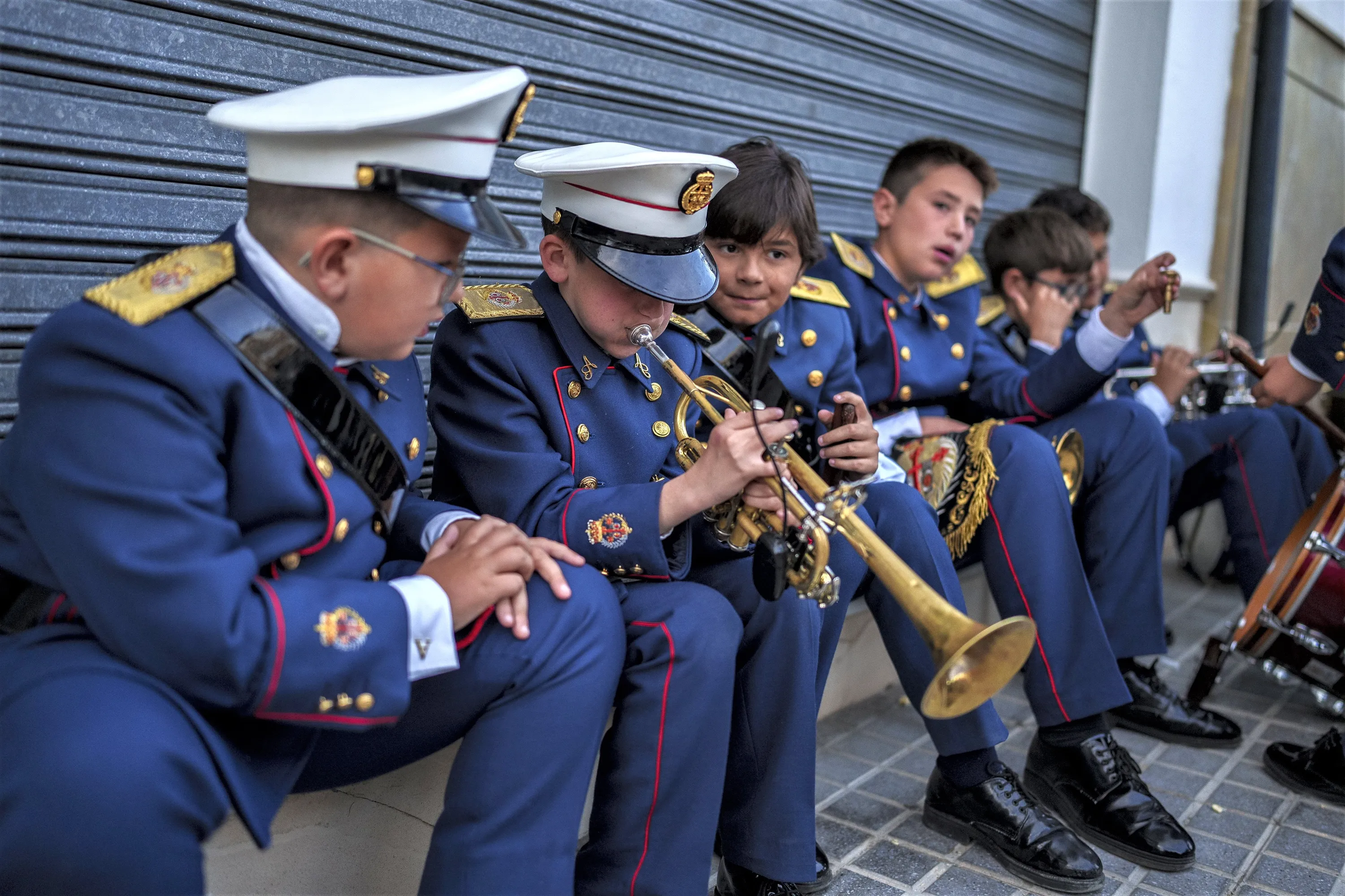 Members of the band practice prior to the procession at the Veracruz church in Aguilar de la Frontera, southern Spain, Tuesday, April 4, 2023. Hundreds of processions take place throughout Spain during the Easter Holy Week. (Photo by Manu Fernandez/AP Photo)