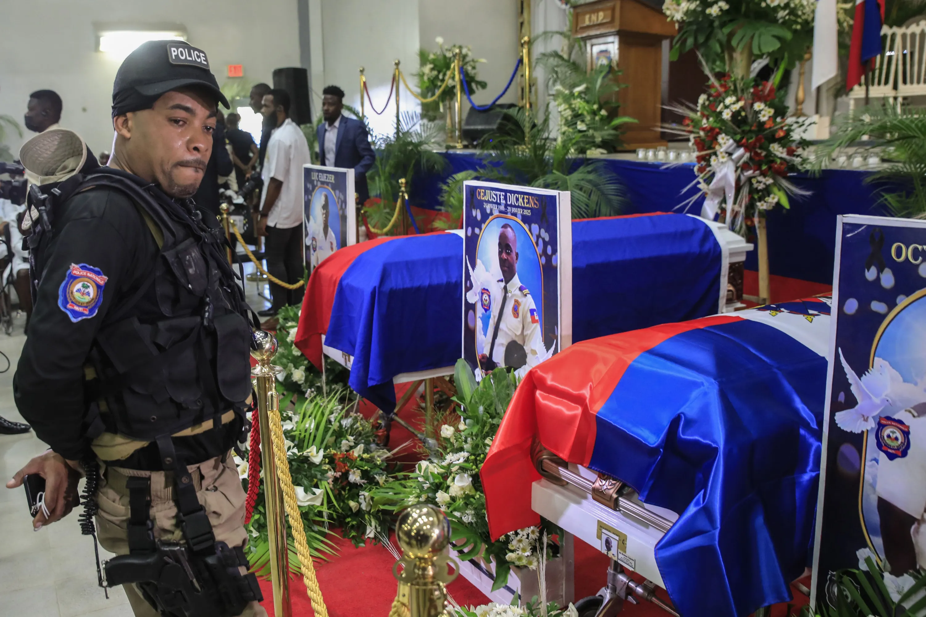 A police officer cries next to coffins containing the bodies of three police officers killed in the line of duty, at the Police Academy in Port-au-Prince, Haiti, Tuesday, January 31, 2023. The officers were killed in an ambush by gang members in the capital on Jan. 20. (Photo by Joseph Odelyn/AP Photo)