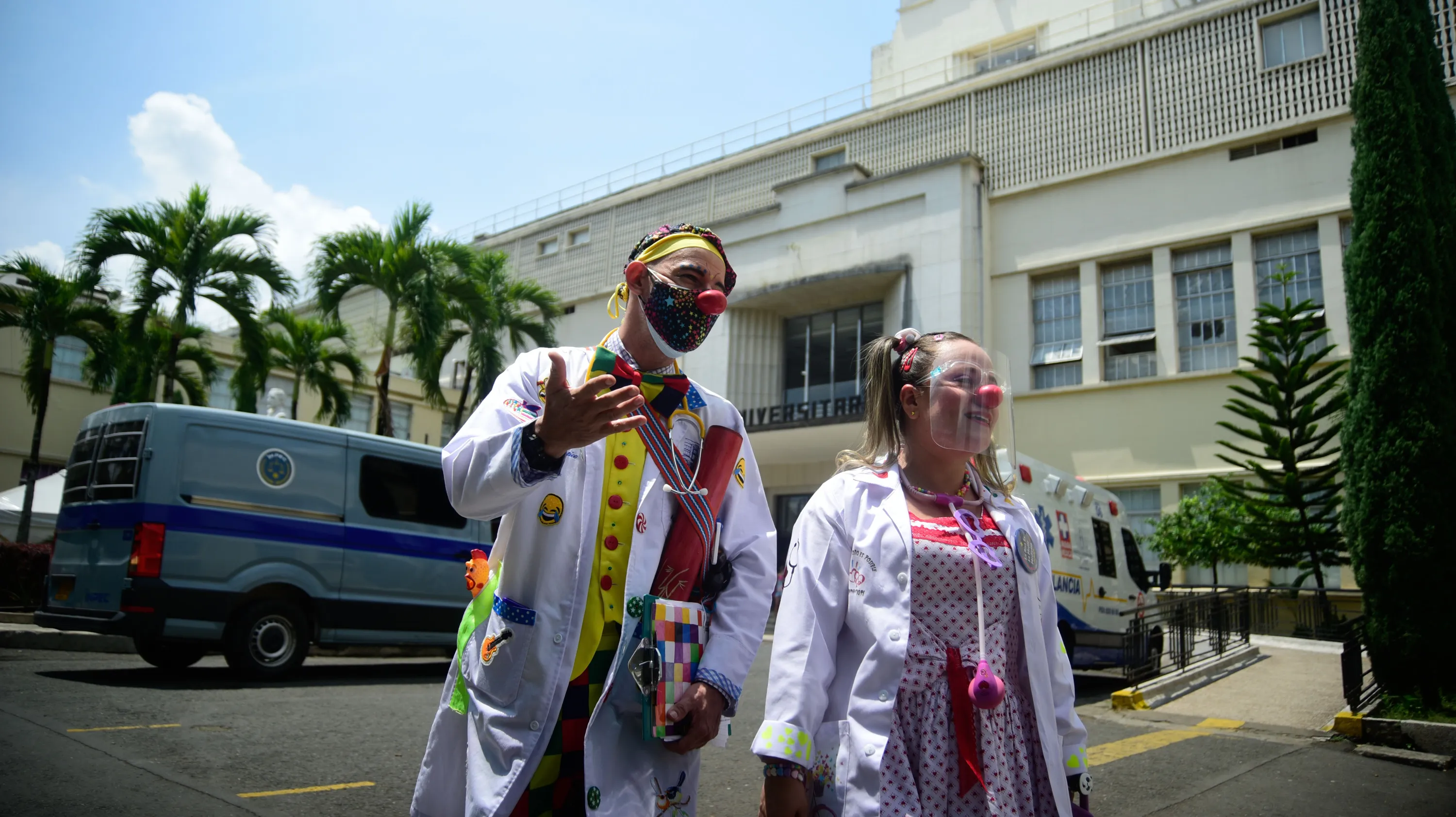 Medical doctors Leslie and Douglas who are in charge of laughter therapy in the general pediatrics section of Valle University Hospital try to bring joy and hope to the ill children in Cali, Colombia on February 16, 2022. 5 years ago Leslie Vargas, a psychologist from the city of Cali, implements laughter therapy for children with complex and terminal illnesses. With a colorful wardrobe, another doctor plays the tragic days that the disease makes them suffer. The Madre de Dios Foundation is the place where they usually does laughter therapy and leaves the children with the hope of recovering soon. (Photo by Edwin Rodriguez Pipicano/Anadolu Agency via Getty Images)