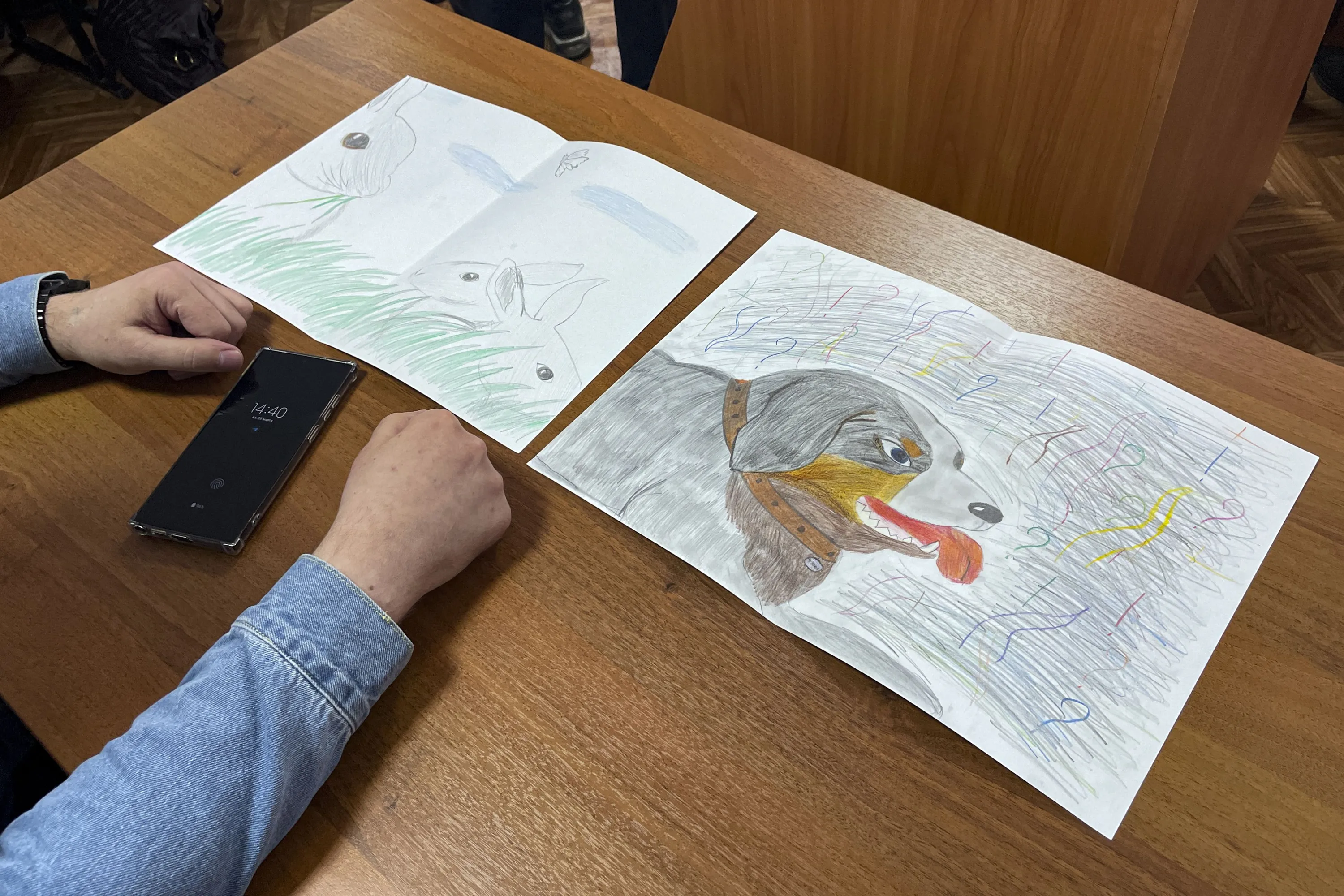 Moskalyov's lawyer Vladimir Biliyenko shows drawings that Maria Moskalyova, daughter of Alexei Moskalyov, drew for her father in a courtroom in Yefremov, Tula region, some 300 kilometers (186 miles) south of Moscow, Russia, Monday, March 27, 2023. A court in Russia on Tuesday convicted a single father over social media posts criticizing the war in Ukraine and sentenced him to two years in prison – a case brought to the attention of authorities by his daughter's drawings against the invasion at school, according to the man's lawyer and local activists. The 54-year-old Moskalyov, a single father of a 13-year-old daughter, was accused of repeatedly discrediting the Russian army, a criminal offense in accordance to a law Russian authorities adopted shortly after sending troops into Ukraine. (Photo by AP Photo/Stringer)