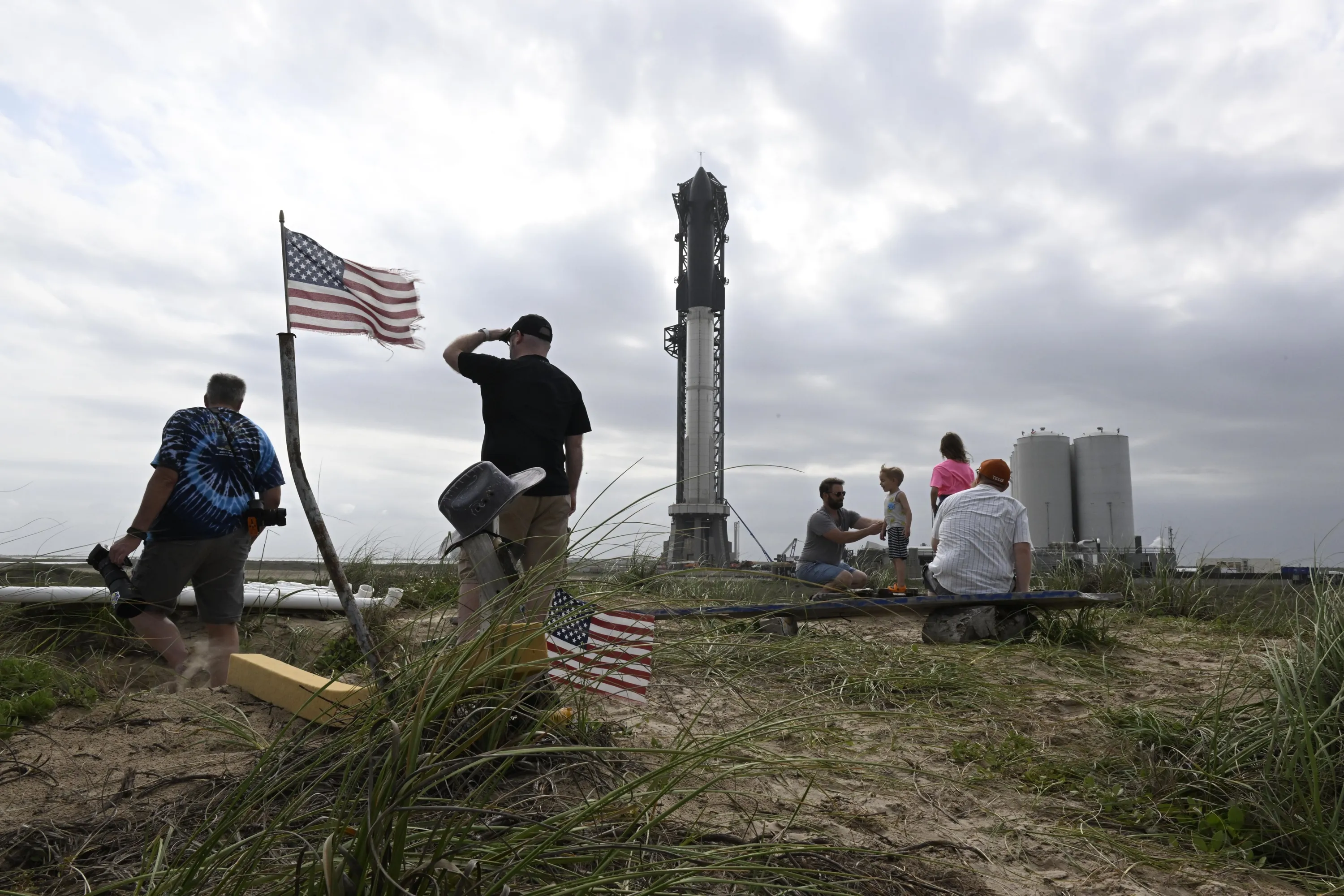 Space fans walk the dunes as workers prepare the SpaceX's Starship spacecraft and Super Heavy rocket as they attempt to schedule another launch launch from Starbase after it was scrubbed on April 17, 2023. (Photo by Jonathan Newton/The Washington Post)