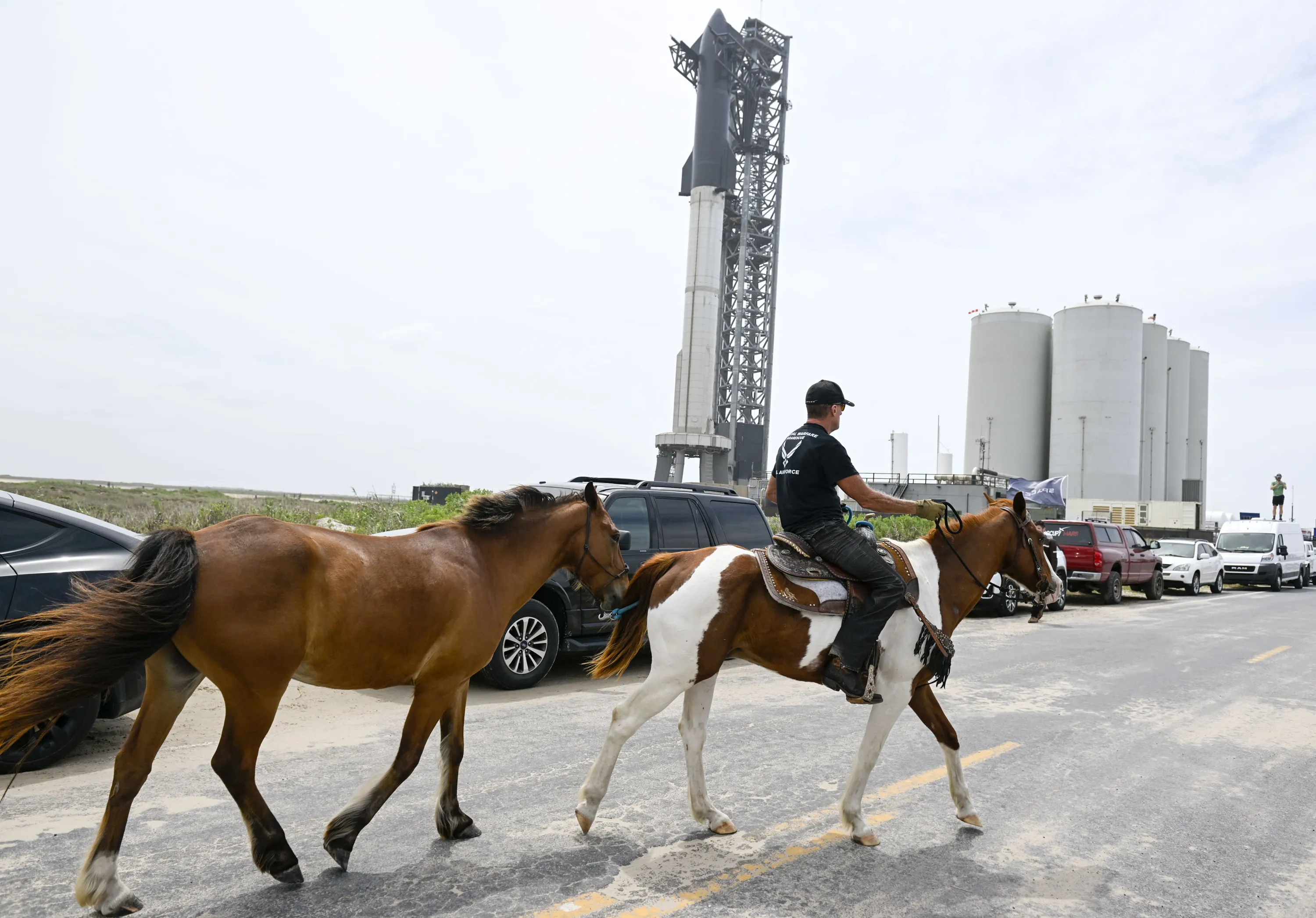 Local resident Gene Gore rides his horse Texas and pulls Disco as he checks out the SpaceX Starship spacecraft and Super Heavy rocket on the launch pad at Starbase on April 16, 2023. (Photo by Jonathan Newton/The Washington Post)