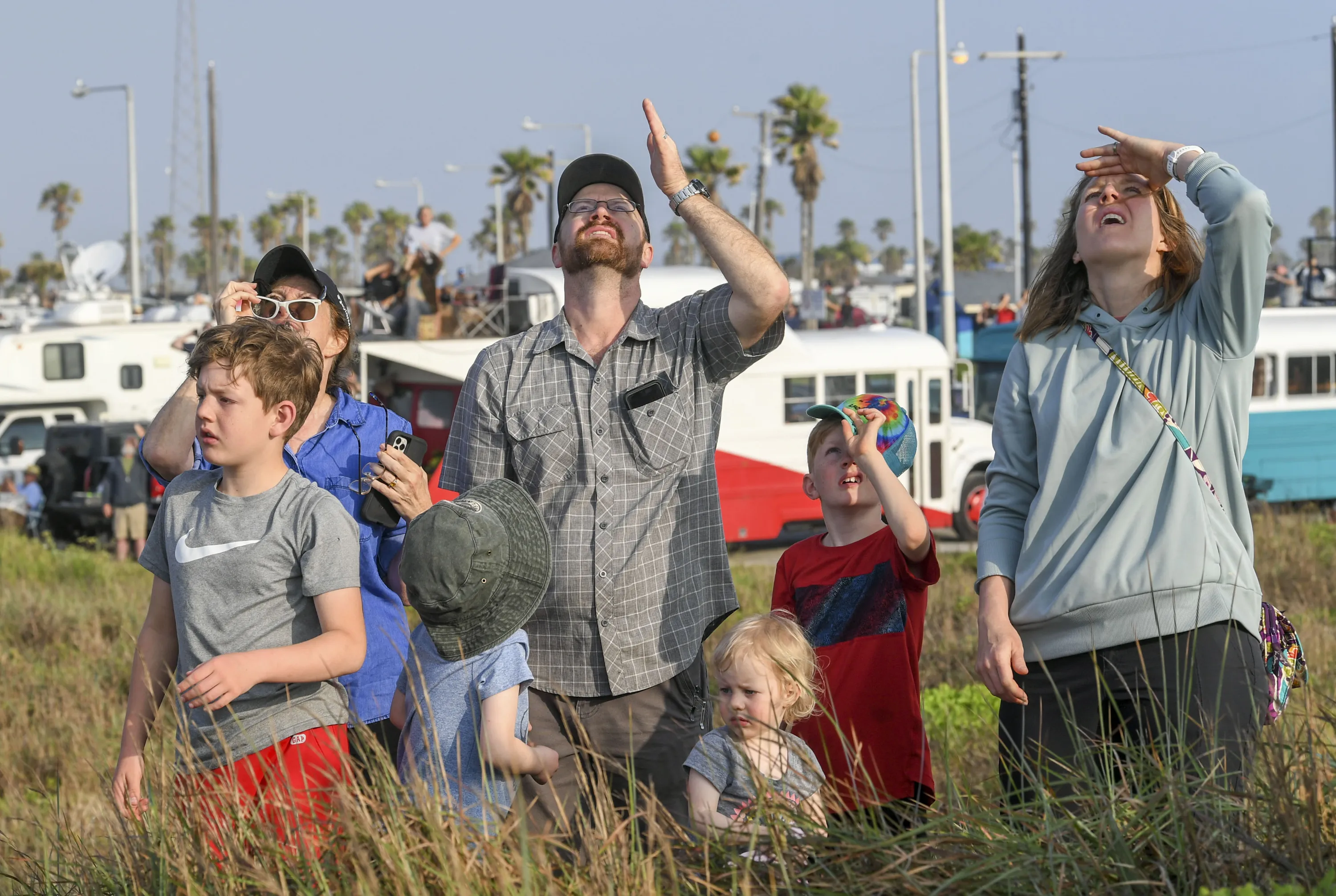 Ross Inman (center) along with his wife, Janel, along with their four kids Levi, Judah, Gabriel and Beatrix and grandmother Sharla McMichael (far left) watch the SpaceX's Starship spacecraft and Super Heavy rocket explode after launch from Starbase on April 20, 2023. (Photo by Jonathan Newton/The Washington Post)