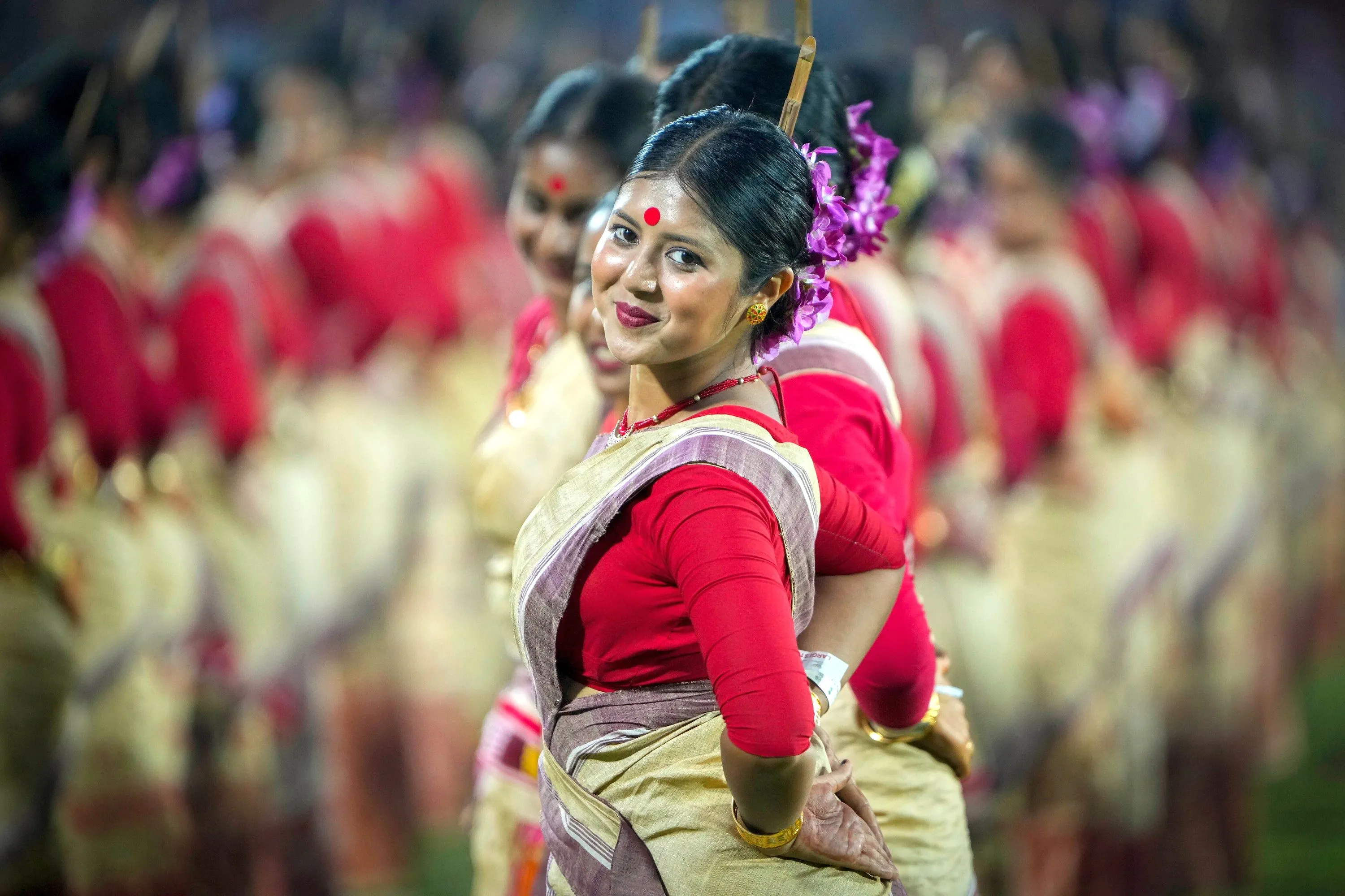 Assamese dancers in traditional attire perform as they attempt Guinness World Record in the largest folk dance performance category in Guwahati, India, Thursday, April 13, 2023. (Photo by Anupam Nath/AP Photo)