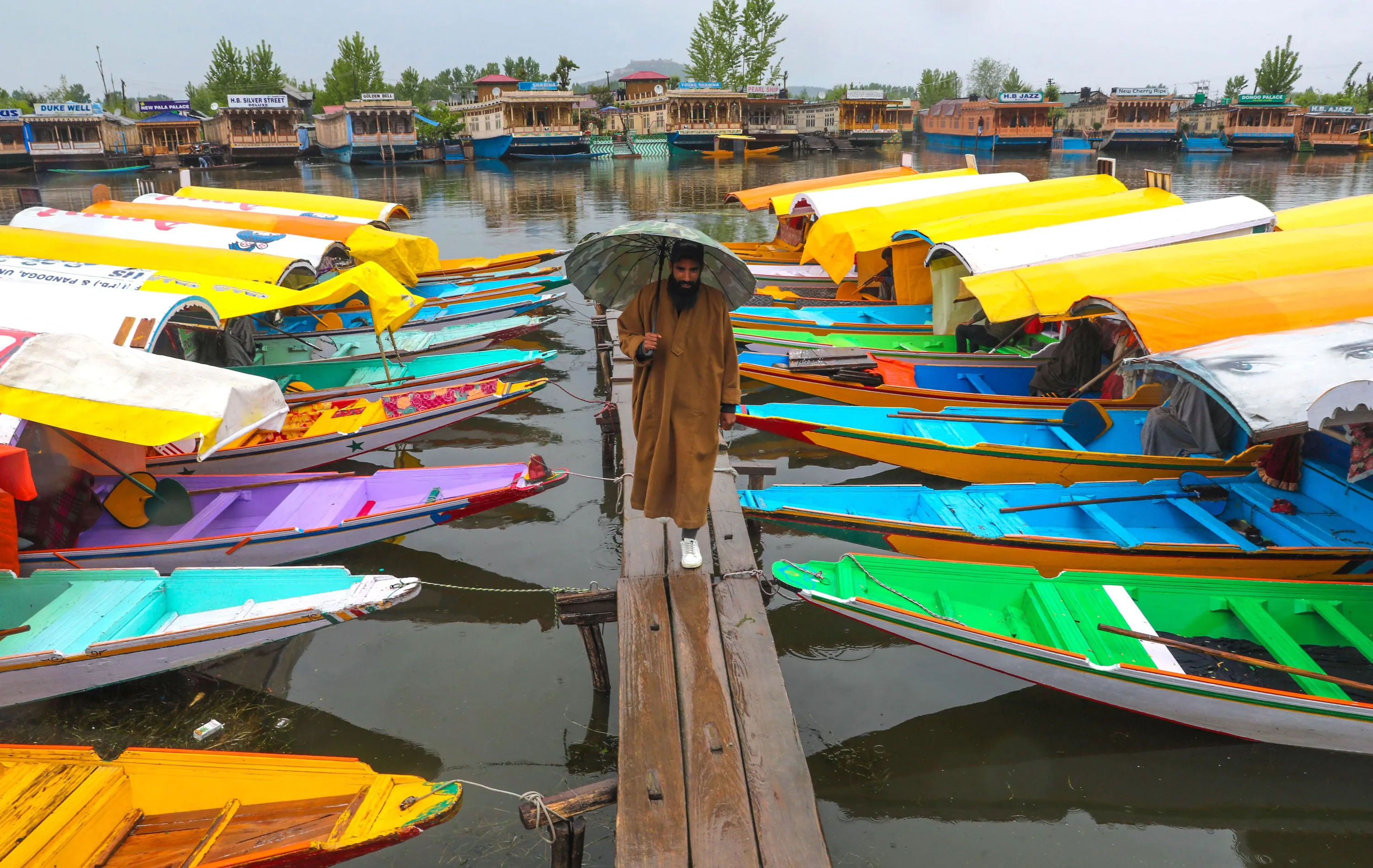 A Kashmiri holds a umbrella to protect himself from rain as he walk on temporary wooden bridge on the banks of Dal Lake in Srinagar, the summer capital of Indian Kashmir, 19 April 2023. Rain lashed plains and higher reaches experienced fresh snowfall in Kashmir. The Meteorological Department has forecasted significant improvement in prevailing weather conditions from Thursday 20 April onwards in the region. Due to rain, the water level has been increased in water bodies. (Photo by Farooq Khan/EPA)