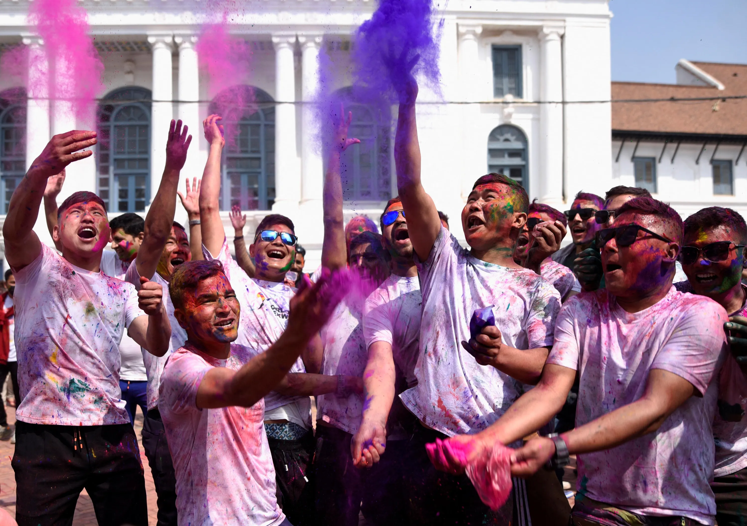 People throw coloured powder as they celebrate Holi, the Festival of Colours in Kathmandu, Nepal on March 06, 2023. (Photo by Monika Malla/Reuters)