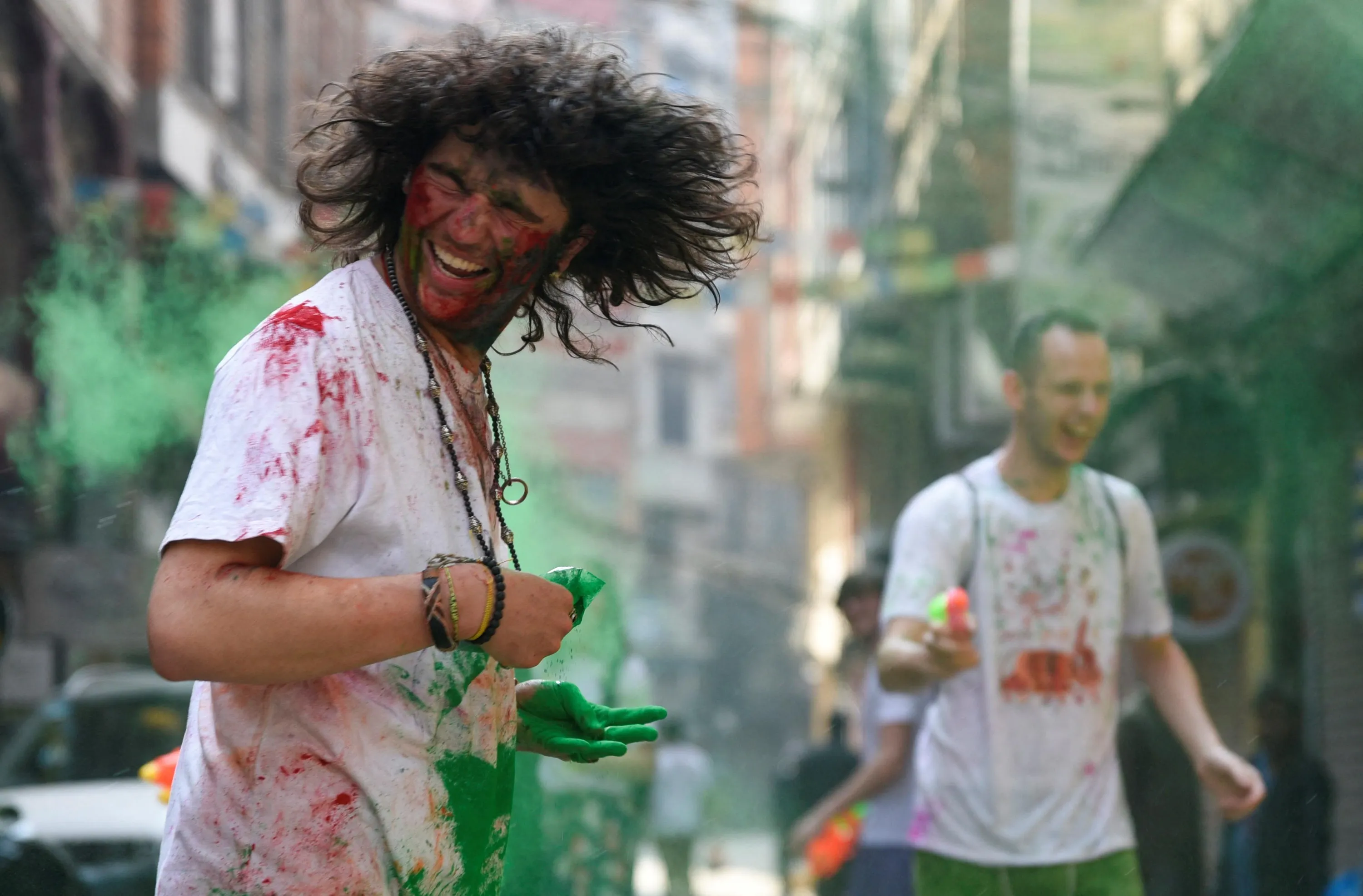 A foreigner reacts while celebrating Holi, the Festival of Colours in Kathmandu, Nepal on March 06, 2023. (Photo by Monika Malla/Reuters)