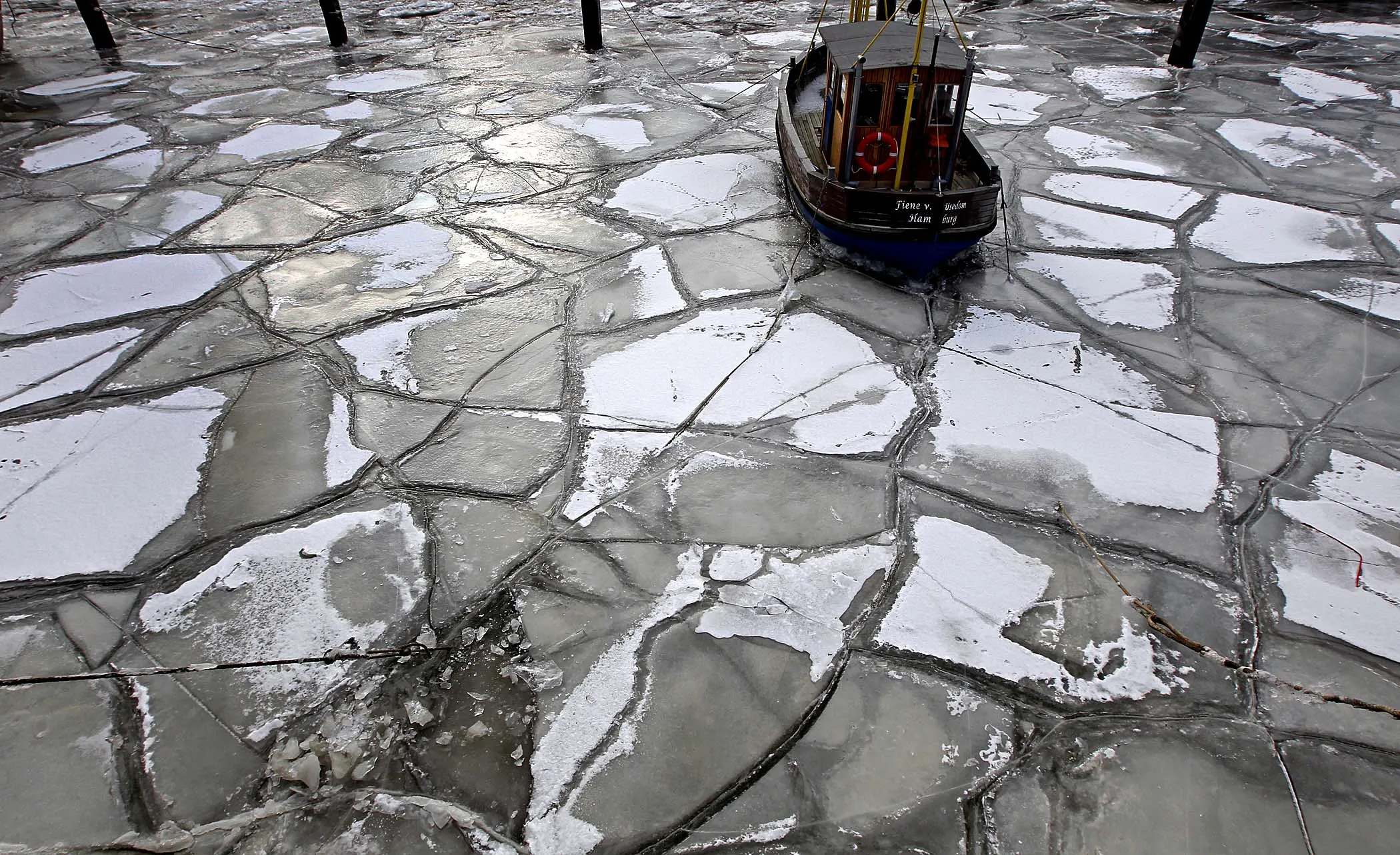 A boat is trapped in the ice in Hamburg, Germany, on February 8, 2012. (Photo by Matthias Schrader/Associated Press)