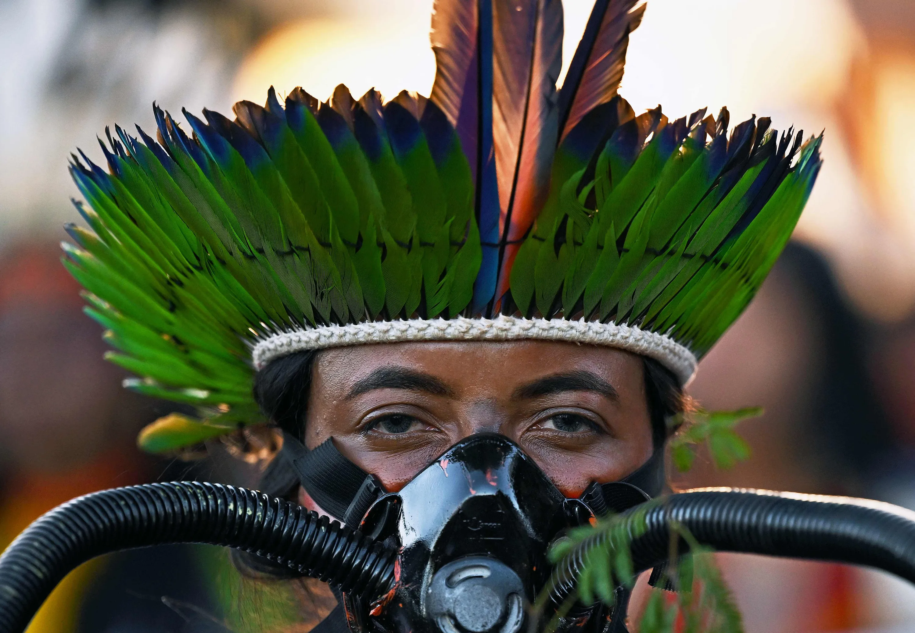 An indigenous woman participates in a protest march during the Terra Livre Indigenous camp in Brasilia on April 26, 2023. The camp will run until April 29, 2023, and is focused on raising awareness about indigenous rights and land issues and promoting indigenous culture. (Photo by Carl de Souza/AFP Photo)