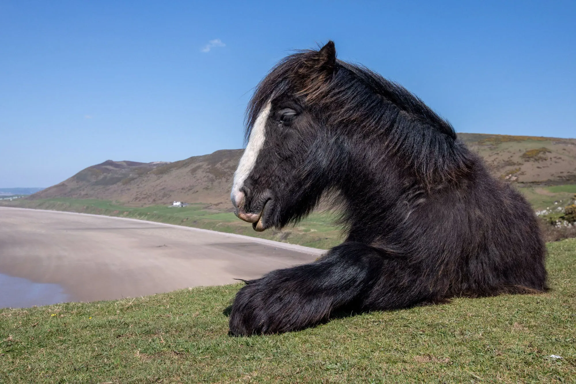 A cob horse for conservation grazing rests on the clifftops of Rhossili, Swansea, Britain on April 20, 2023. (Photo by Joann Randles/Reuters)
