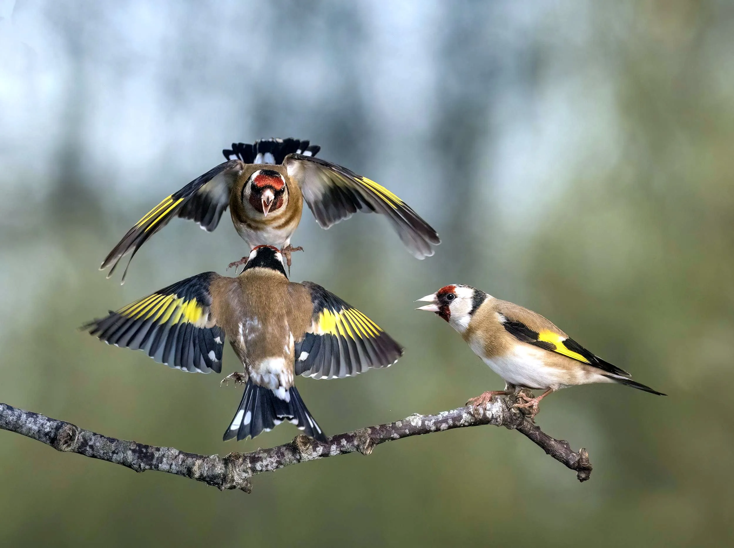 A goldfinch appears to referee a bout between two others in a garden in Lytham St Annes, Lancashire on April 17, 2023. (Photo by Ivor Ottley/Animal News Agency)