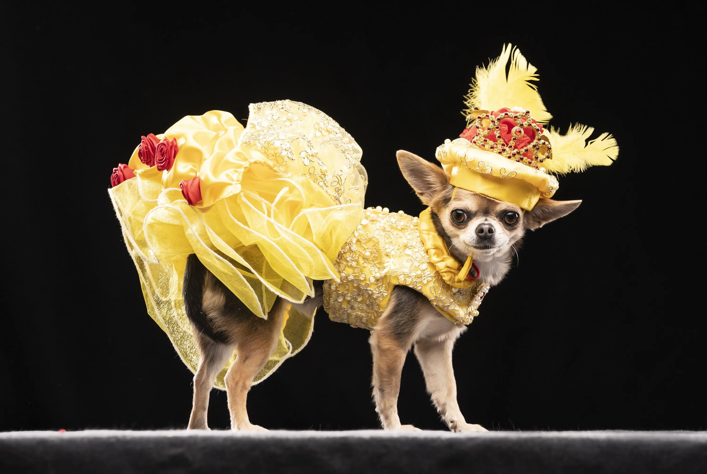 Lindy Lou the Chihuahua models a design inspired by Belle's ballroom gown from Beauty and the Beast, during the Hollywood (A day at the Oscar's) themed Furbabies Dog Pageant at Collingham Memorial Hall, Leeds on Sunday, March 20, 2022. (Photo by Danny Lawson/PA Images via Getty Images)