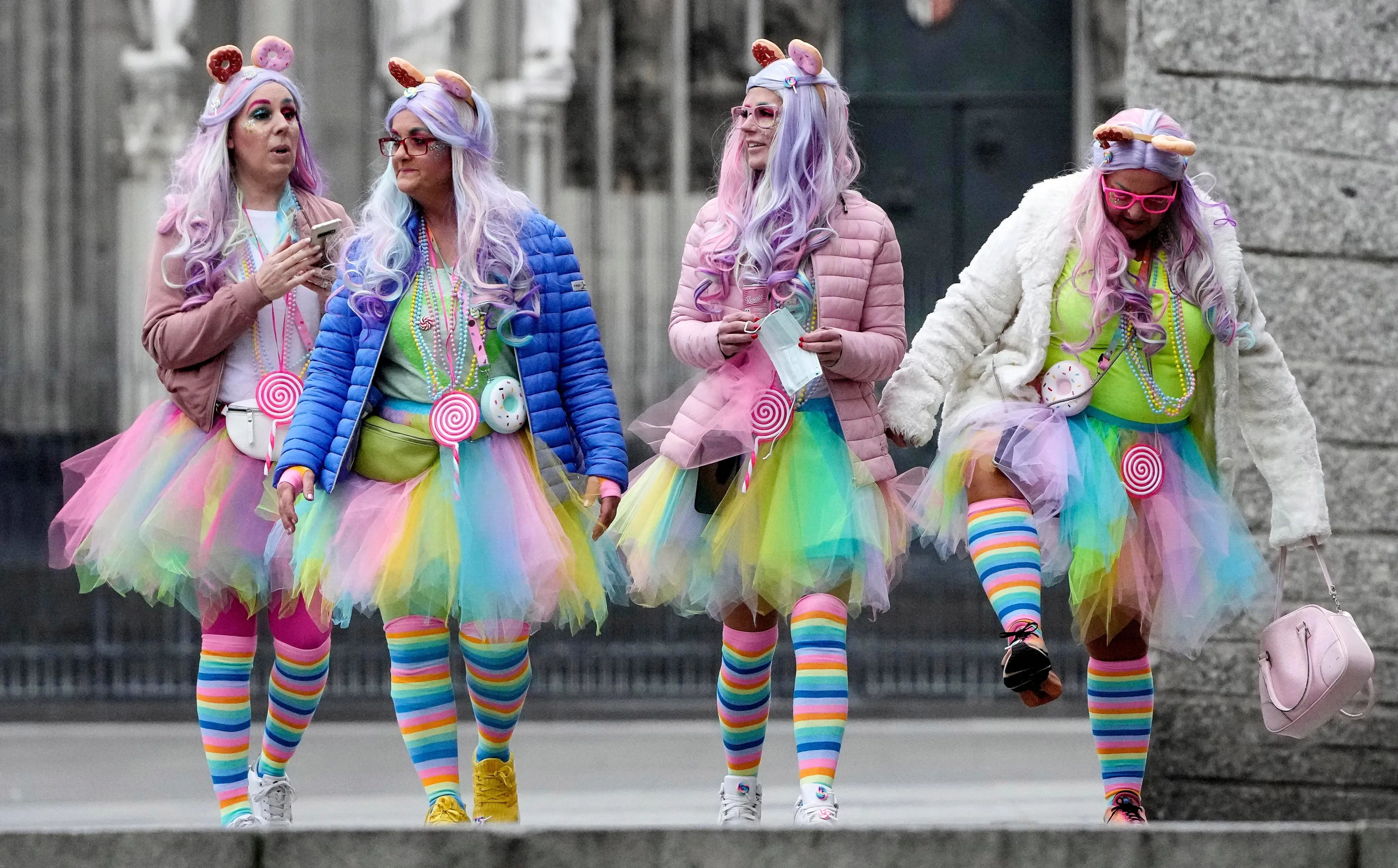 Female revelers walk at the Cologne Cathedrat at the start of the street carnival in Cologne, Germany, Thursday, February 24, 2022. Due to the coronavirus pandemic and the war in Ukraine much less revelers came for the street carnival, when in the past hundreds of thousands celebrated in the streets of Cologne. (Photo by Martin Meissner/AP Photo)