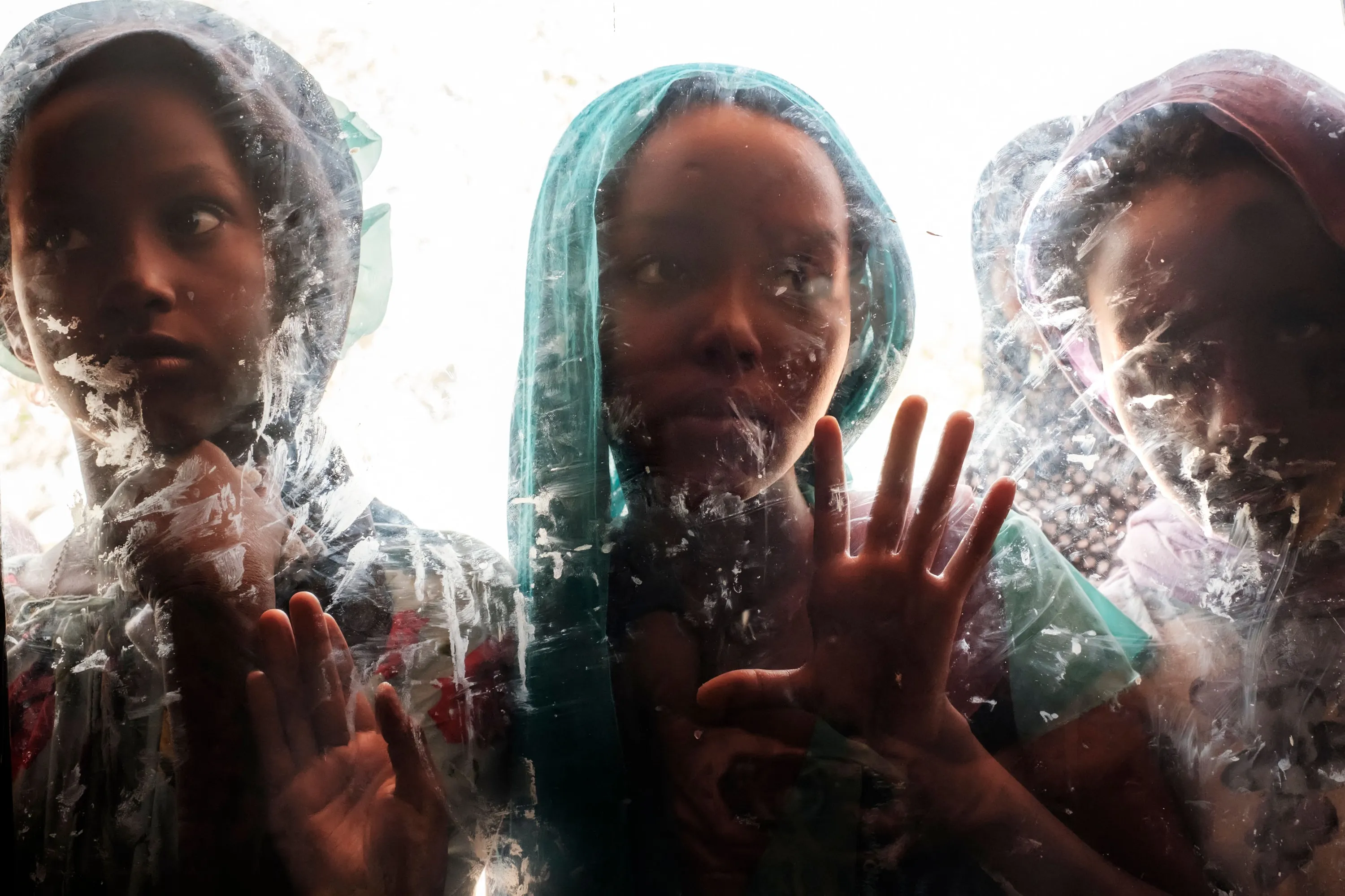 Girls are seen through a glass at the compound of the Agda Hotel, in the city of Semera, Afar region, Ethiopia, on February 14, 2022. Thousands of Eritrean refugees, shell-shocked and separated from loved ones, fled on foot through harsh terrain to escape artillery and gunfire. (Photo by Eduardo Soteras/AFP Photo)