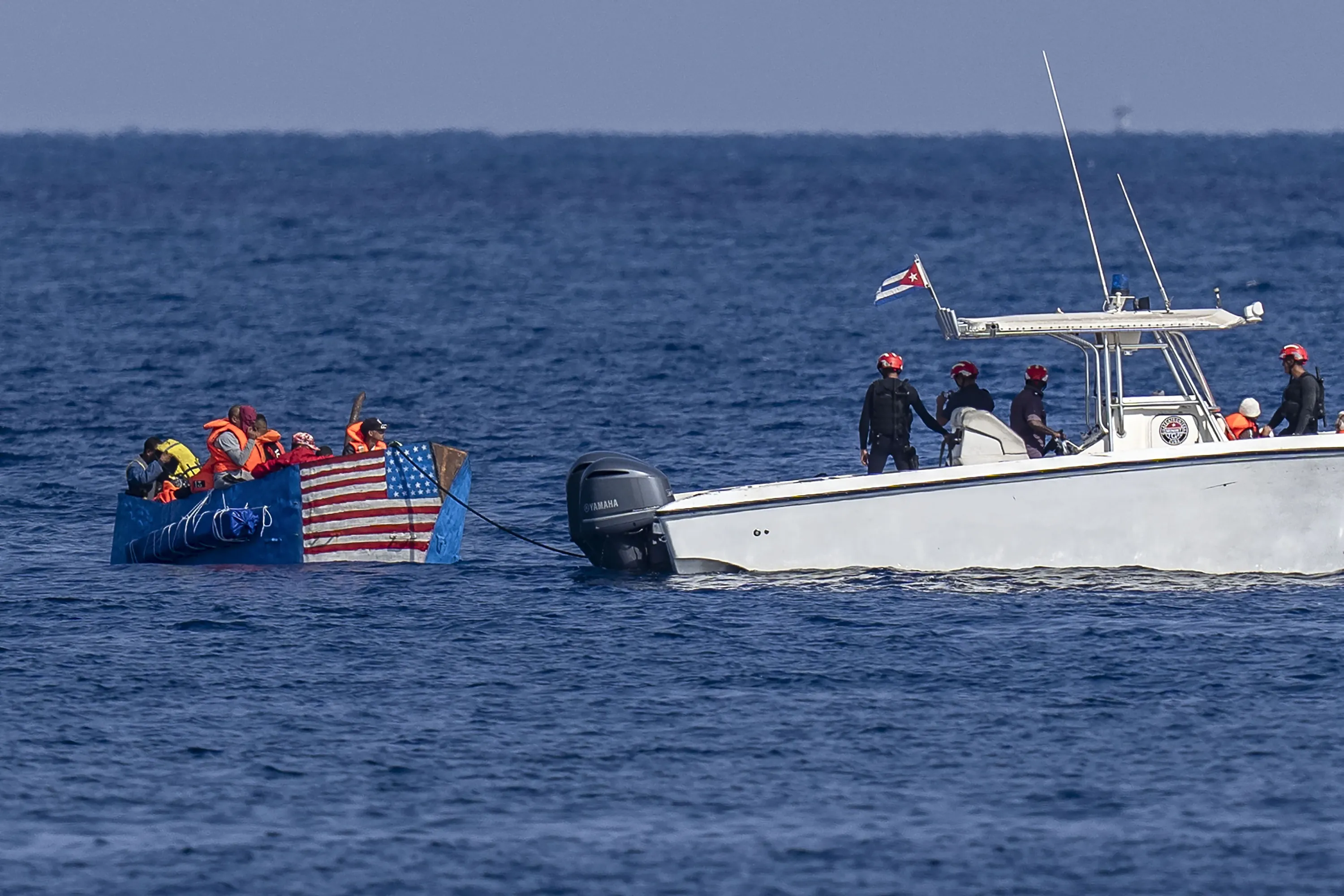 People in a makeshift boat with the U.S. flag painted on the side are captured by the Cuban Coast Guard, seen from the Malecon seawall in Havana, Cuba, Monday, December 12, 2022. (Photo by Ramon Espinosa/AP Photo)