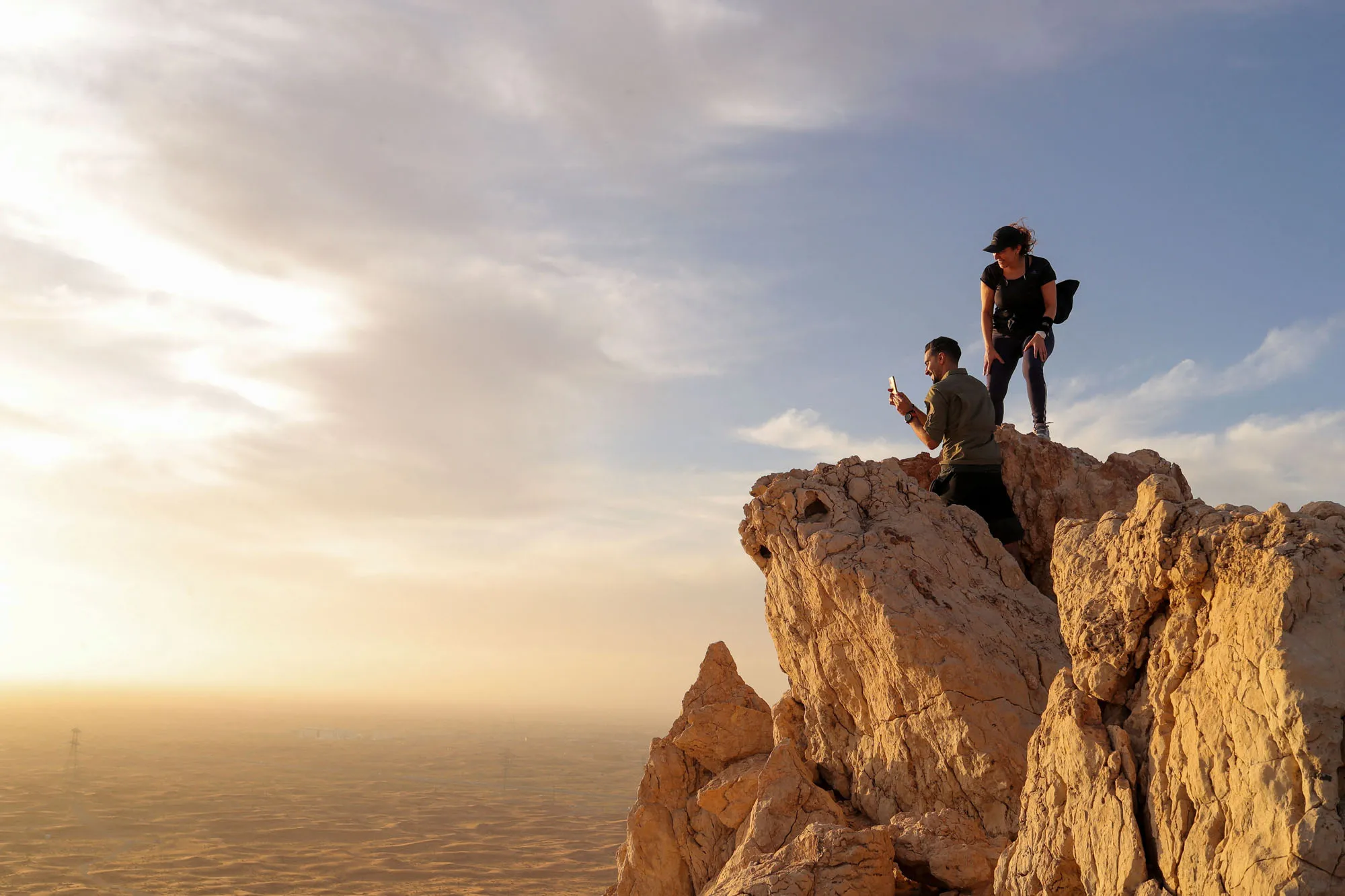 Two hikers take pictures of the sunset at the Fossil Rock Nature Reserve as they make their way to share an Iftar (breaking fast) meal during the holy month of Ramadan in Sharjah, United Arab Emirates on April 15, 2023. (Photo by Amr Alfiky/Reuters)