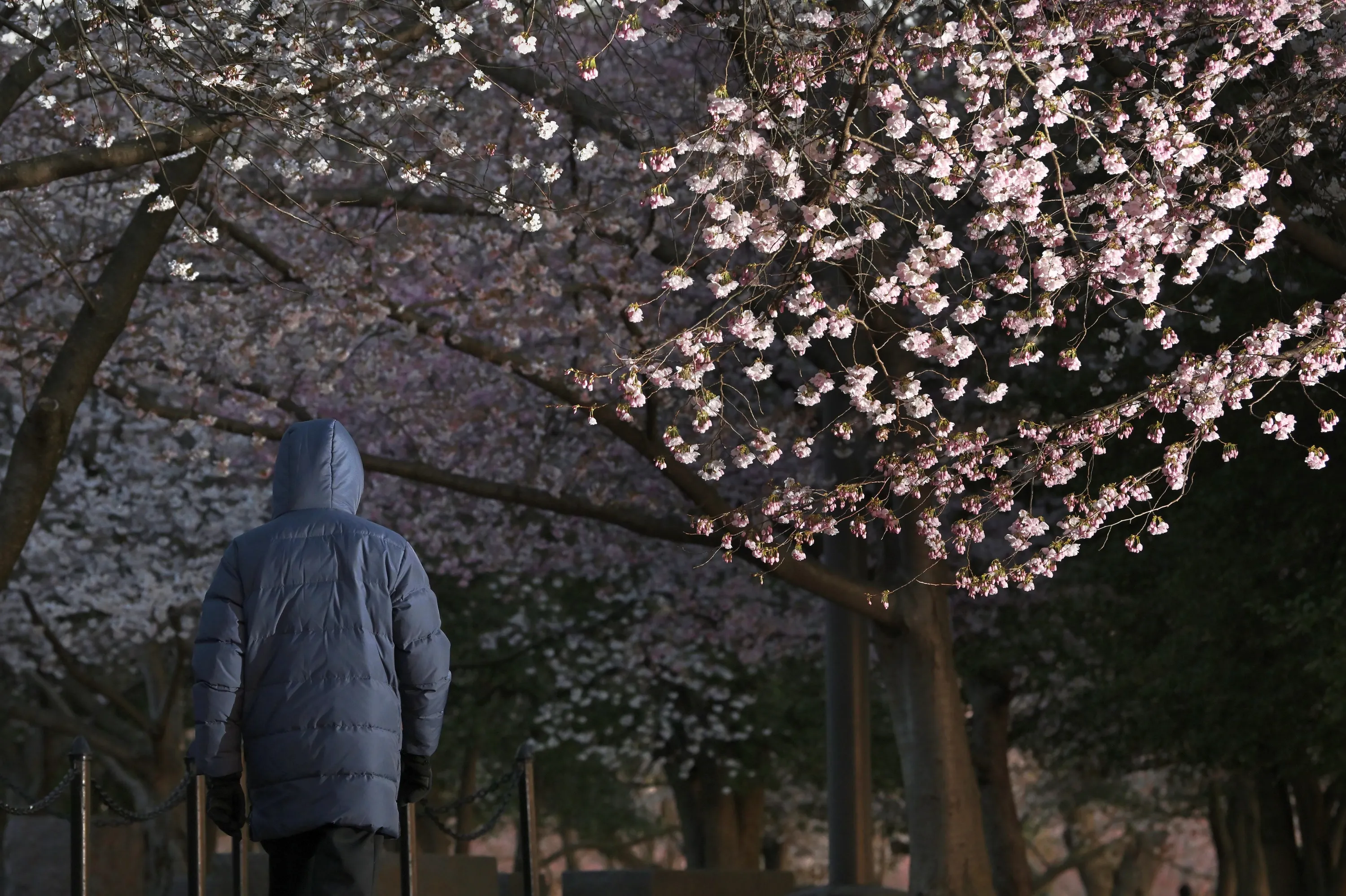 Blooming cherry blossoms are illuminated by a camera flash not far from the Tidal Basin on Monday March 20, 2023 in Washington, DC. The blossoms are nearing peak bloom. (Photo by Matt McClain/The Washington Post)
