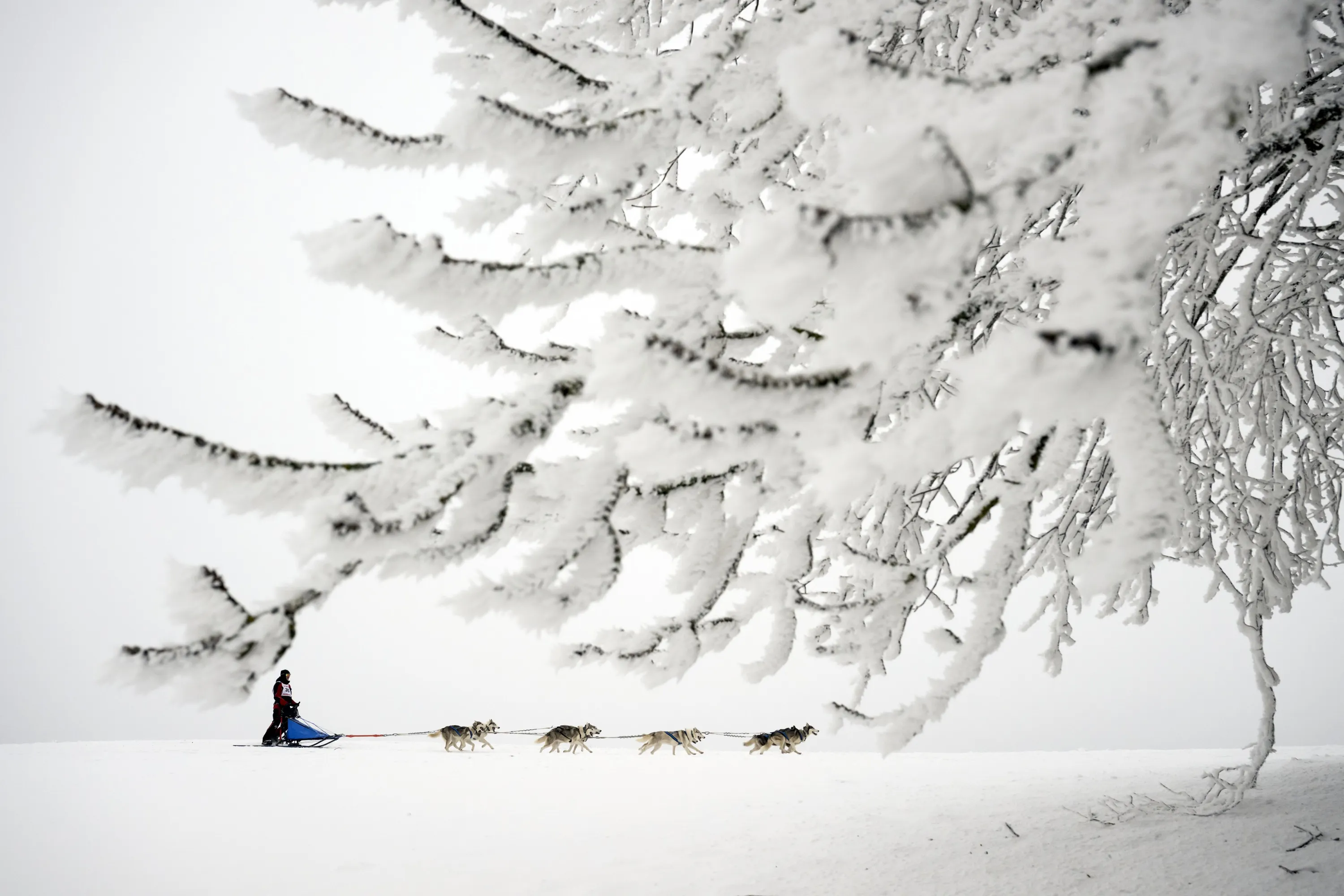 A musher and his dogs in action during the 50th edition of the Dog Sled Race and Nordic Dog Festival in Saignelegier, canton of Jura, Switzerland, 28 January 2023. This dog sled race brings together some 110 teams with a total of more than 800 dogs, mostly husky. (Photo by Anthony Anex/EPA/EFE)