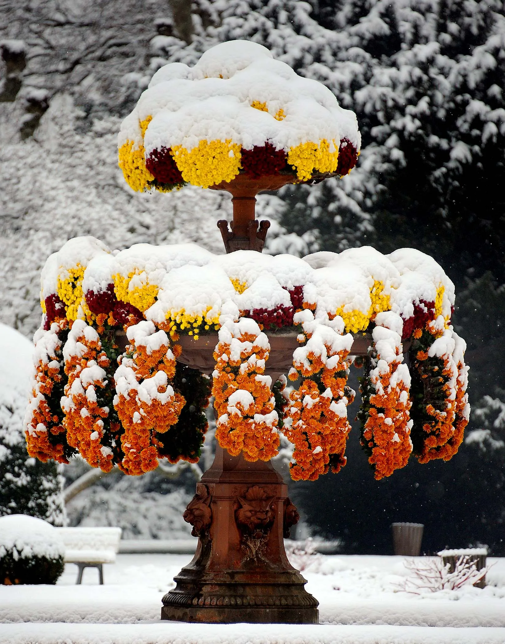 Flowers are covered in snow at the Orangerie park in Strasbourg, France, on November 29, 2010. (Photo by Frederick Florin/AFP Photo)