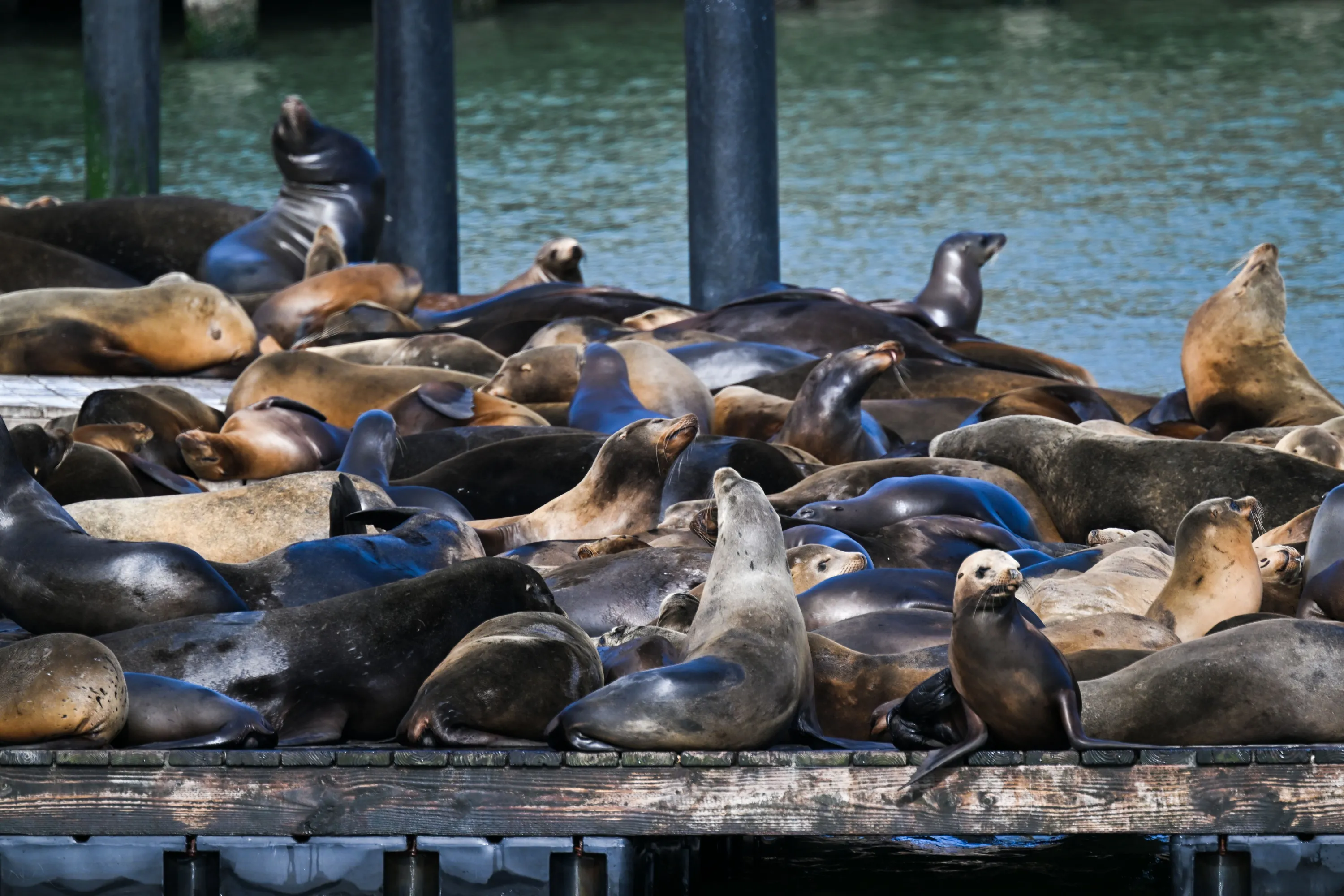Sea lions are seen at the Pier 39 of Fishermanâs Wharf in San Francisco, California, United States on April 18, 2023. The sea lions camped out in PIER 39âs West Marina have been endearingly coined The PIERâs âSea Lebrities.â The boisterous pinnipeds started arriving in droves in January 1990, shortly after the 1989 Loma Prieta earthquake. (Photo by Tayfun Coskun/Anadolu Agency via Getty Images)