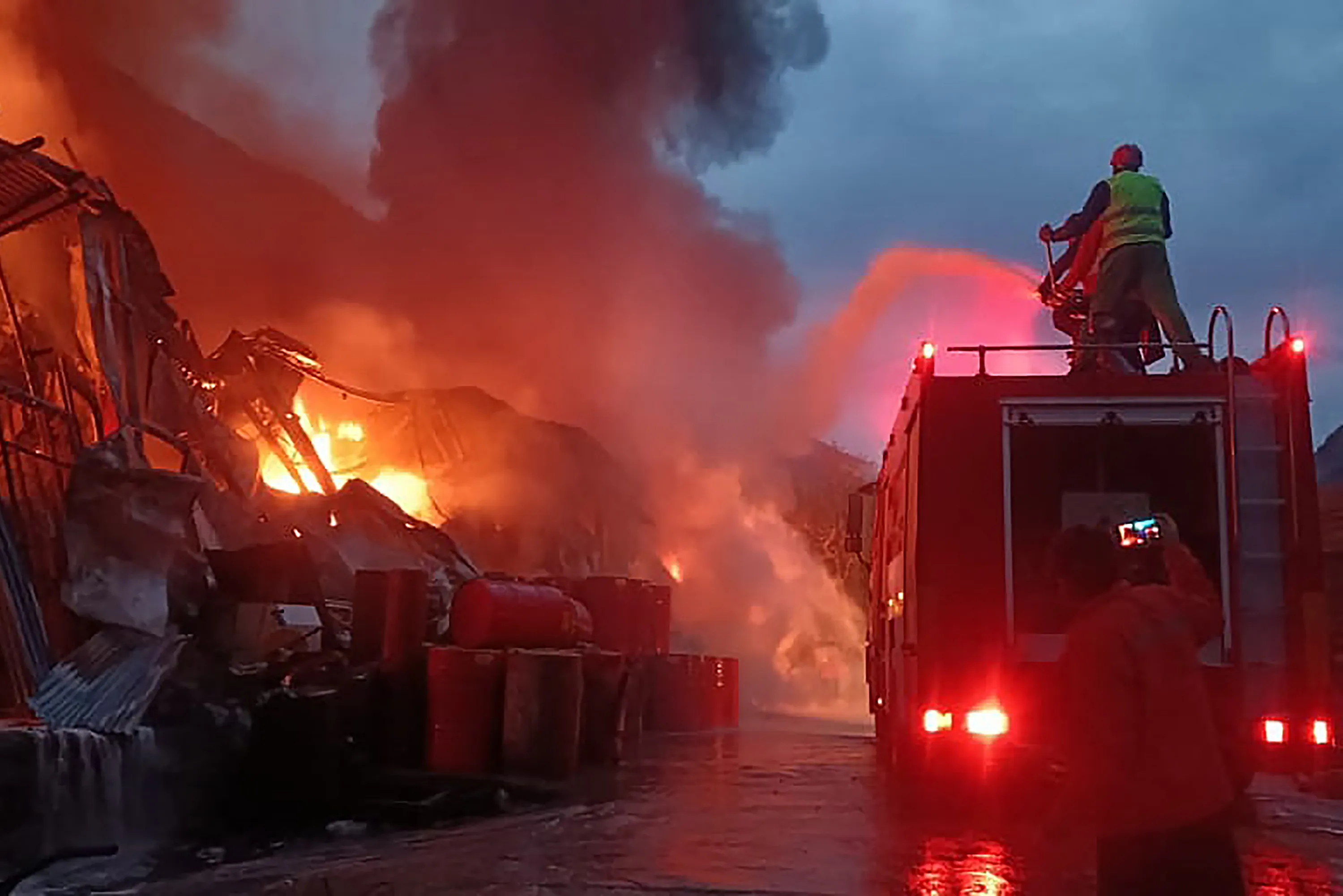 This handout photograph released by Pakistan's Emergency Rescue 1122 Service on April 4, 2023 shows firefighters trying to extinguish a fire that erupted at a warehouse of a hydropower dam construction site in Dasu, the main town in Upper Kohistan district of Pakistan's Khyber Pakhtunkhwa province. A fire ripped through the camp of a Chinese company managing the construction of a remote hydropower dam in northwestern Pakistan on April 4, officials said. (Photo by Pakistan's Emergency Rescue 1122 Service/AFP Photo)