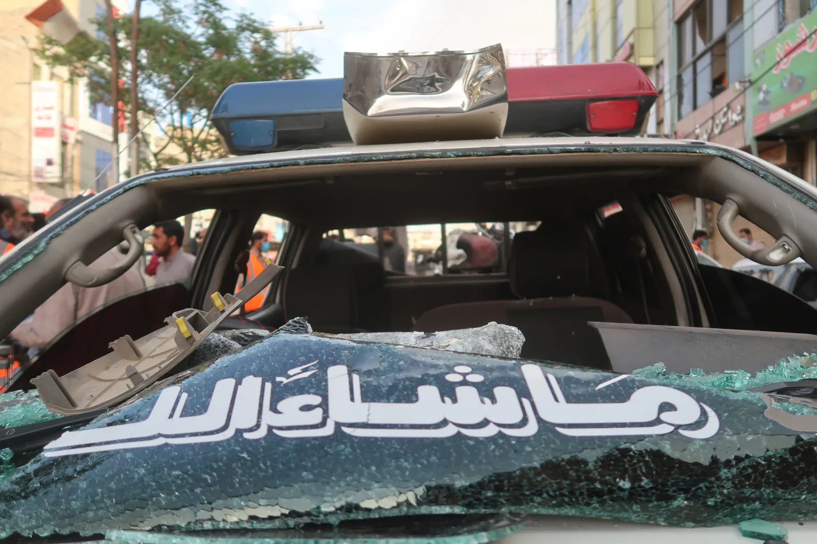 A damaged police car as Pakistani security officials inspect the scene of a blast in Quetta, the provincial capital of Baluchistan, Pakistan, 10 April 2023. At least four people have been killed and six injured in a bombing targeting a police vehicle, police said. (Photo by Fayyaz Ahmad/EPA/EFE)