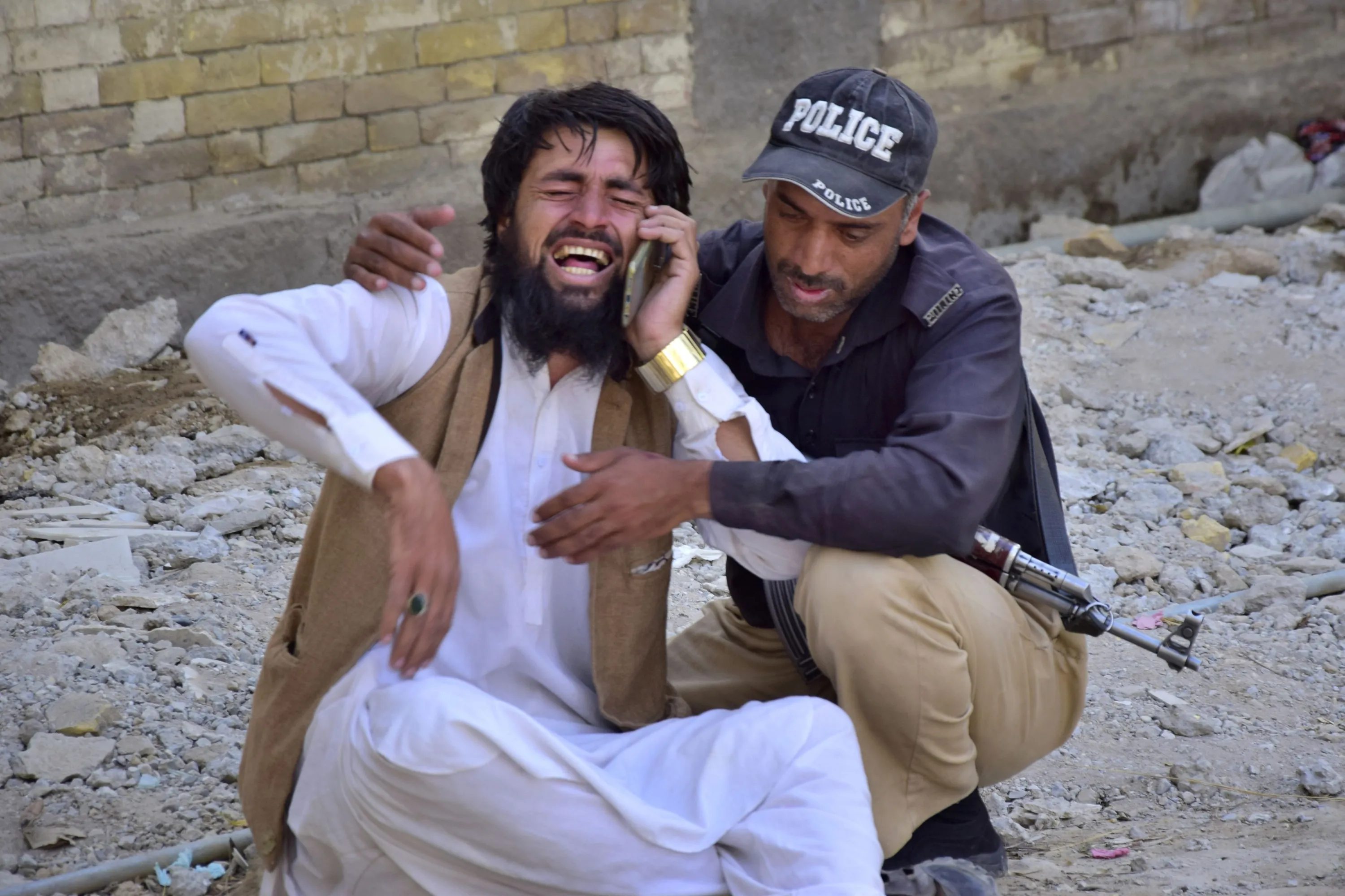 A police officer comforts a man mourning the death of a family member in the bomb blast, at a hospital, in Quetta, Pakistan, Monday, April 10, 2023. A roadside bomb targeting a police vehicle in volatile southwestern Pakistan on Monday killed few people and wounded more than dozen others, mostly civilian pedestrians, a government spokesperson said. (Photo by Arshad Butt/AP Photo)