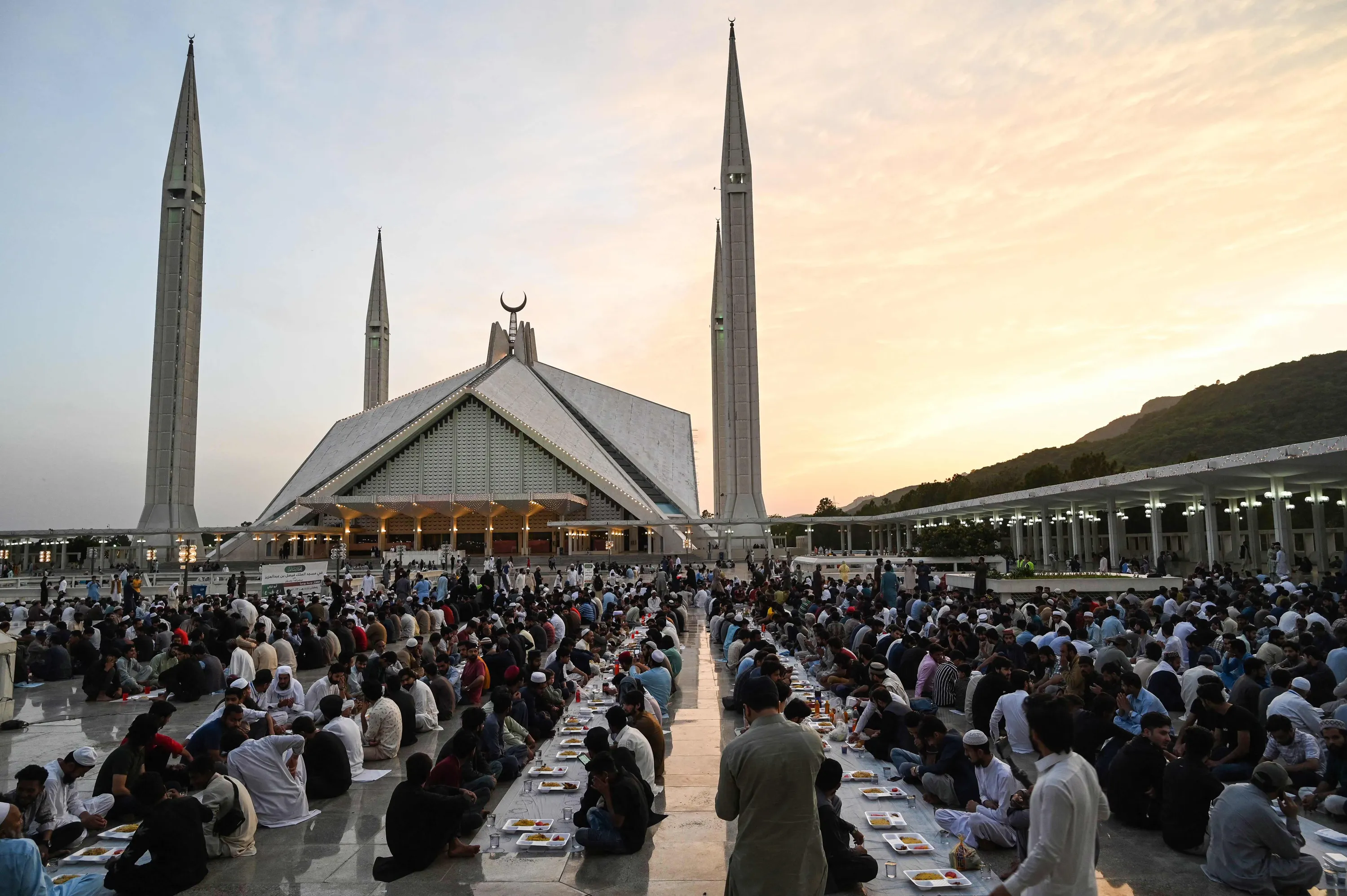 Muslim devotees arrive to sit before the start of Itikaf, a spiritual retreat, stay in the last ten days of the holy fasting month of Ramadan in the grand Faisal Mosque in Islamabad on April 11, 2023. (Photo by Farooq Naeem/AFP Photo)