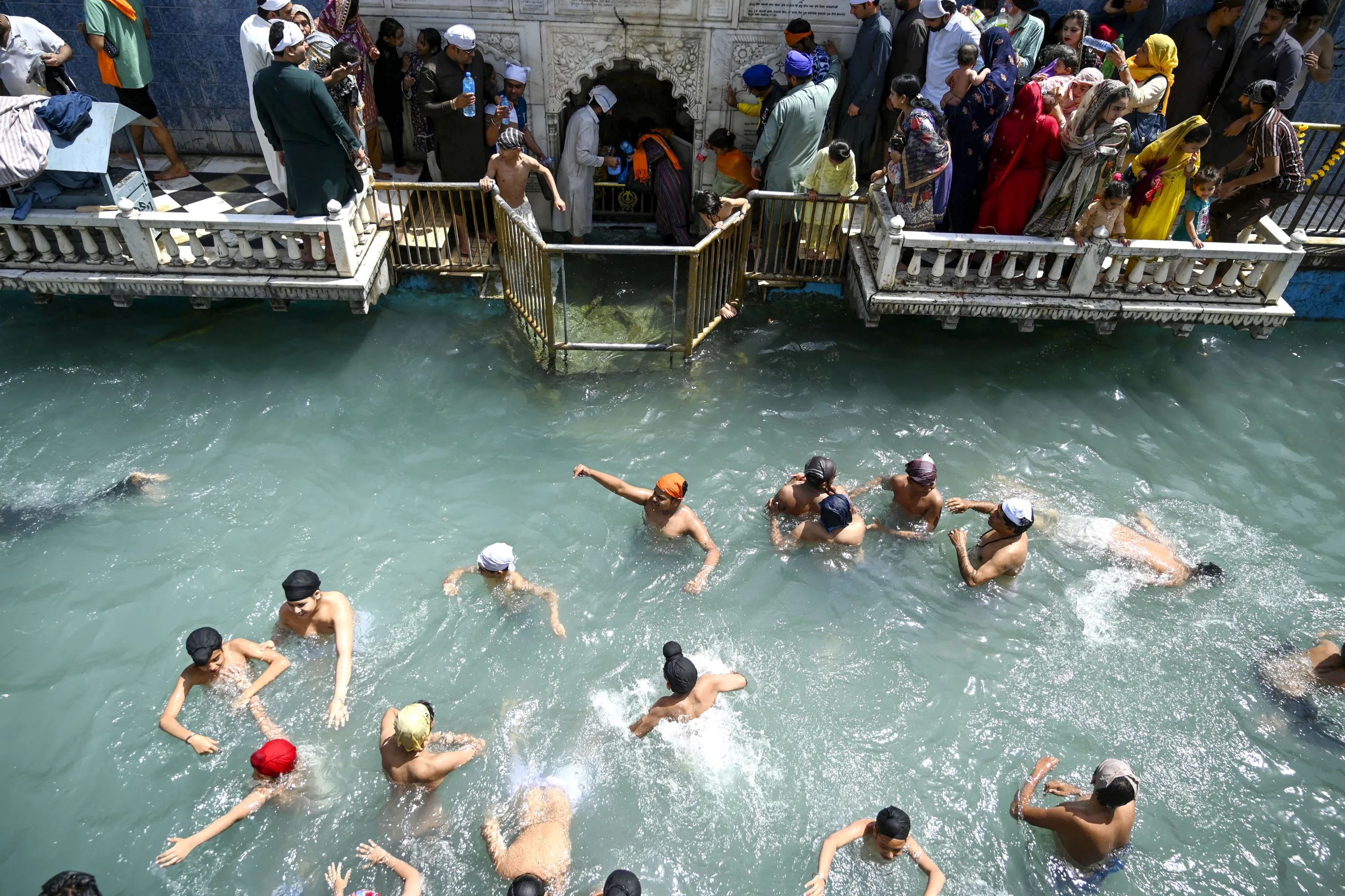 Sikh pilgrims take dips in the holy sarovar at the Gurdwara Panja Sahib during “Baisakhi” a spring harvest festival, in Hasan Abdal on April 14, 2023. (Photo by Aamir Qureshi/AFP Photo)