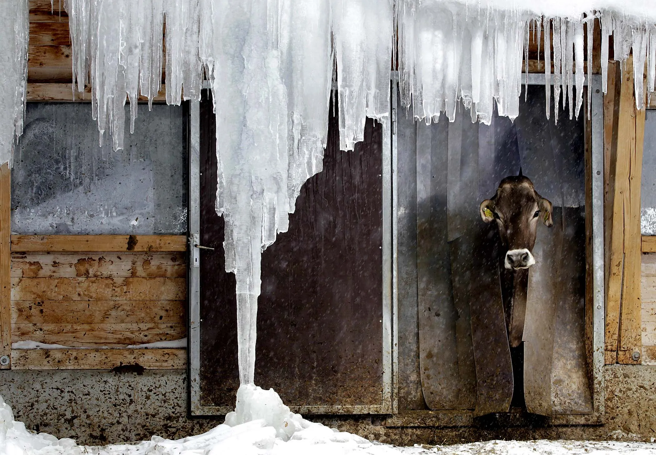 A cow looks out of its stable behind icicles in Davos, Switzerland. (Photo by Arno Balzarini/Keystone)